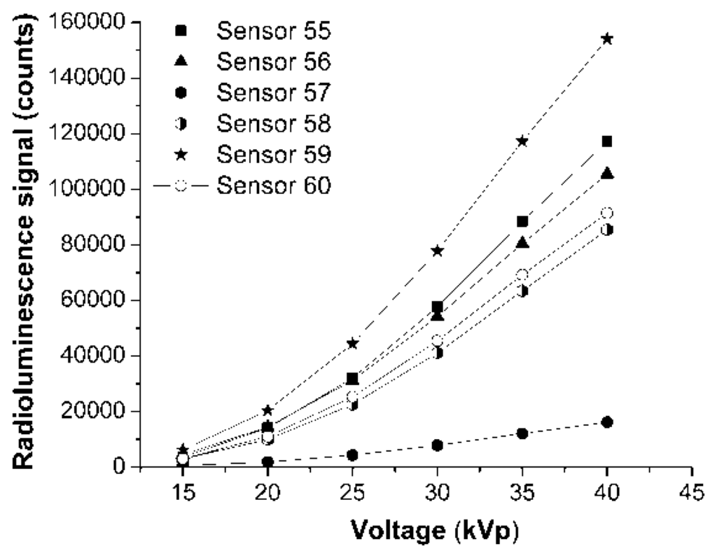3.2. X-Ray Radioluminescence Measurement along Sensors Longitudinal Axis
