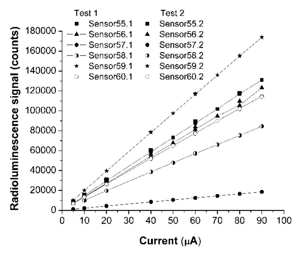 For a fixed value of the X-ray source driving voltage two tests were run for each sensor to evaluate the repeatability of their response. Figure 5 indicates the lack of hysteresis for the sensors response, in the case sensors 55–60.