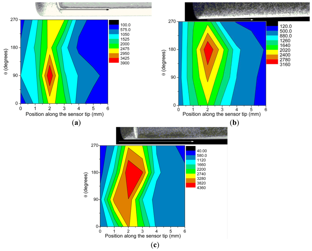 Measurements performed on the sensor tip end (frontal) make possible the assessment of the sensors response dynamic range, linearity, and reproducibility, as function of the X-ray source parameters.