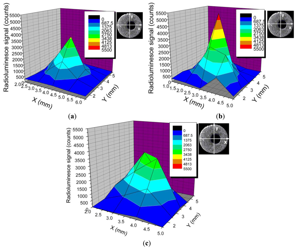 Comparing the results of the radioluminescence tests with those derived from X-ray tomography, the sensor design can be investigated. In the mean time these examination provides information on sensor's spatial resolution.