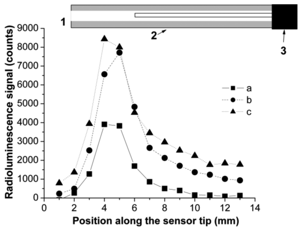 The evaluation of reflectors efficiency for light collection in the guiding optical fiber was done by scanning the sensor 56 along its longitudinal axis and measuring the radioluminescence signal at the other end of the optical fiber (Figure 8).
