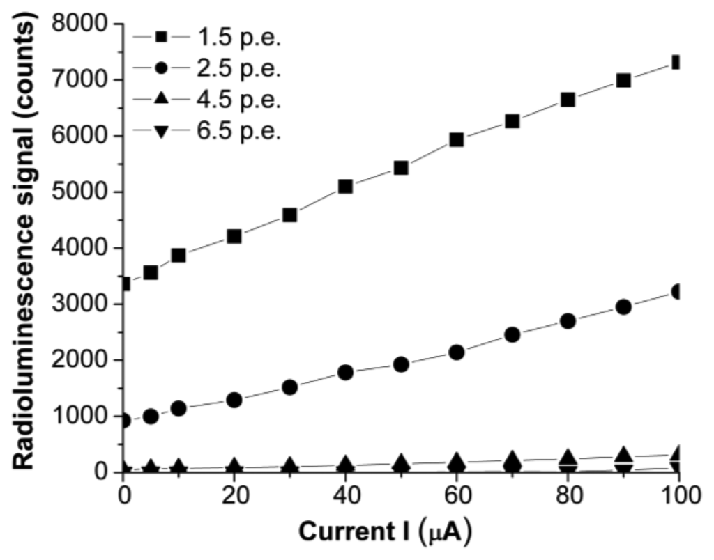 Alternatively, the signal was also monitored by a type C10507-11-100U Multi-Pixel Photon Counter (MPPC), (Hamamatsu, Japan) [19], as a less expensive and easier to handle solution for detection. The MPPC has a spectral response covering the 320 to 900 nm spectral range, with a peaking at 440 nm, a dark count equivalent to 500 kcps, and a photon detection efficiency of 45%, at peak wavelength. The data acquisition form the MPPC is performed with the software provided by the manufacturer. The detector was used in the “pulsed count” mode. For these cases, the gate time was from 1 to 100 ms, whereas the threshold level was set from 1.5 to 6.5 p.e. The spectrometer was used to visualize the spectral response of the sensor, as far as the C10507-11-100U photon counter is not able to provide information of the spectral content of the radioluminescent signal.