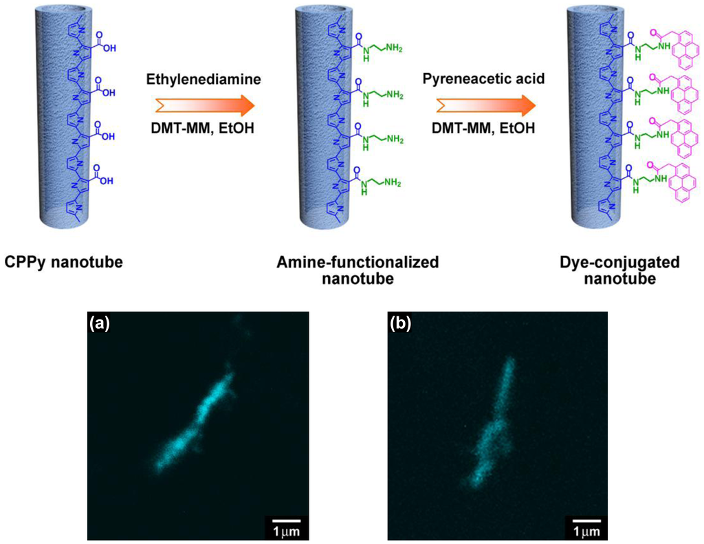 Various functional groups such as –COOH, –CN, –NH2, –SH can interact with metal cations through ion-ion or ion-dipole interactions. Conducting polymers containing either nitrogen or sulfur atoms in their repeating unit are attractive candidates for the preparation of metal/polymer hybrids. For example, polypyrrole (PPy) and polyaniline (PANI) have a nitrogen atom in their heterocyclic ring, and polythiophene (PTh) and poly(3,4-ethylenedioxythiophene) (PEDOT) have a sulfur atom in their heterocyclic ring. Thus, Ag, Au, and Pd nanoparticles could be readily deposited on the surface of PANI, PPy and PEDOT nanostructures without any dispersing or reducing agents [15–18]. On the other hand, monomers with a functional side group can be used to introduce desired functionality to the resulting polymers. Of course, it should be noted that the chemical/physical properties of monomers with a functional side group are different those of unfunctionalized, pristine monomers. Thus, it is important to judiciously choose detailed synthesis conditions for the successful polymerization. There are several good examples of using pyrrole derivatives to fabricate conducting polymer nanostructures with surface functional groups. First, pyrrole has been copolymerized with pyrrole-3-carboxylic acid (P3CA) in emulsion systems to fabricate tubular nanostructures [19–21]. The introduction of carboxylic groups was confirmed by immobilizing a fluorescent dye onto the nanotubes. As shown in Figure 1, the nanotubes exhibited cyan emission with uniform distribution over their surfaces, indicating that the carboxylic groups were thoroughly introduced into the polymer nanotubes.