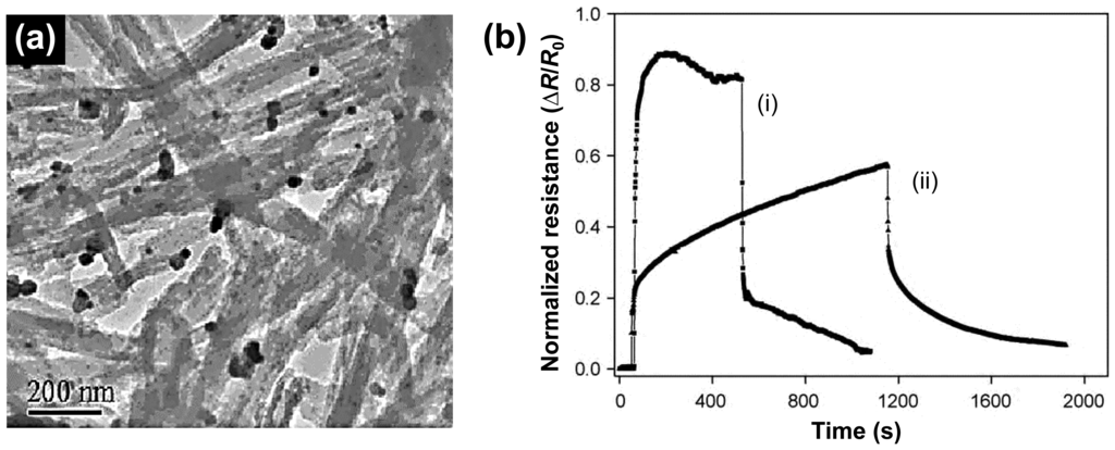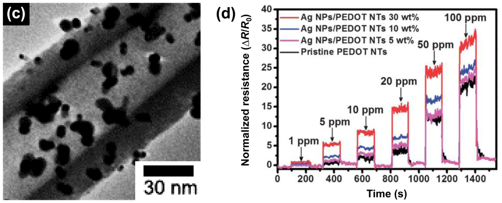 For the detection of NH3 gas, various materials and technologies have been explored. Among many different strategies, the combination of organic-inorganic nanomaterials displayed the most excellent sensing performances toward NH3 gas. Yang et al. provided a facile method in fabricating Ag/AgCl-decorated PPy (PPy/Ag-AgCl) nanotubes [57]. PPy nanotubes were fabricated through assembling process on the reactive self-degraded template with complex of ferric chloride and methyl orange. For uniform decoration of Ag and AgCl nanoclusters, PPy nanotubes were immersed in AgNO3 solution, which resulted in PPy nanotube hybrids, as shown in Figure 10a. The PPy nanotube hybrids were utilized as chemiresistors in chemical sensor applications and showed significant conductivity changes when NH3 gas (100 ppm) was exposed into the nanotube hybrids (Figure 10b). Moreover, the response time was ca. 150 s to reach the maximum and stable reproducible responses were also displayed. Several researchers also demonstrated that nanostructured metals deposited or chemically connected on the surface of the conducting polymers exhibits size-dependent sensing properties. Hong et al. reported the fabrication of a nanohybrids consisting of PPy and Pd through thermal dynamic refluxing of Pd salt and subsequent encapsulating of formed Pd nanoparticles with a PPy shell via vapor deposition polymerization [58]. The nanohybrids designed with synthetic variables, including reaction time and polymer additives, were characterized by TEM and atomic force microscopy, and then they were utilized as the chemiresistor in NH3 sensing system. The electrical responses from Pd-encapsulated PPy nanoparticles toward NH3 were highly fast and stable at the range of the 50–200 ppm NH3 gases. Moreover, the response and recovery time were 14 s and 148 s for 1000 ppm NH3, respectively. Judging from these results, the size of Pd nanoparticles and the morphology of the hybrid films are important to achieve high-performance ammonia sensors based on the nanohybrids. As advanced nanohybrids for NH3 sensing materials, Park et al. constructed silver nanoparticles-decorated PEDOT nanotubes using a modified concurrent redox reaction in porous alumina membrane [59]. To fabricate the PEDOT nanotube hybrids, the alumina template was immersed into Fe(NO3)3 and AgNO3 solutions and vaporized EDOT monomer was introduced into the template membrane under 10−2 Torr at 60 °C for 3 h. Finally, PEDOT nanohybrids were successfully obtained after etching the template membrane. To characterize these nanohybrids, various analysts including TEM, SEM, and XRD analysis were employed (Figure 10c). The diameter and wall-thickness of PEDOT nanohybrids were ca. 100 and ca. 25 nm, and the size of the decorated silver nanoparticles was ca. 10 nm. The PEDOT nanotube hybrids were utilized as the chemiresistor in ammonia sensor by virtue of the enhanced conductivity and high affinity toward NH3 by silver nanoparticles. The highest sensitivity and rapid response time toward NH3 (1 ppm and less than 1s) can be obtained from PEDOT nanohybrids owing to the silver nanoparticles dispersed on the surface of PEDOT nanotubes. Moreover, the optimal deposited amount of silver nanoparticles were also determined by adjusting AgNO3 concentration (Figure 10d). The sensing geometry was constructed by the deposition of nanohybrids on the electrodes and induced the resistance changes when NH3 was adsorbed on the surface of nanohybrids. They showed comprehensive sensing properties using experimental date: (i) the sensitivity and selectivity changes dependence upon amount of Ag NPs on the surface of PEDOT nanotubes, and (ii) response and recovery time upon increasing NH3 concentrations.