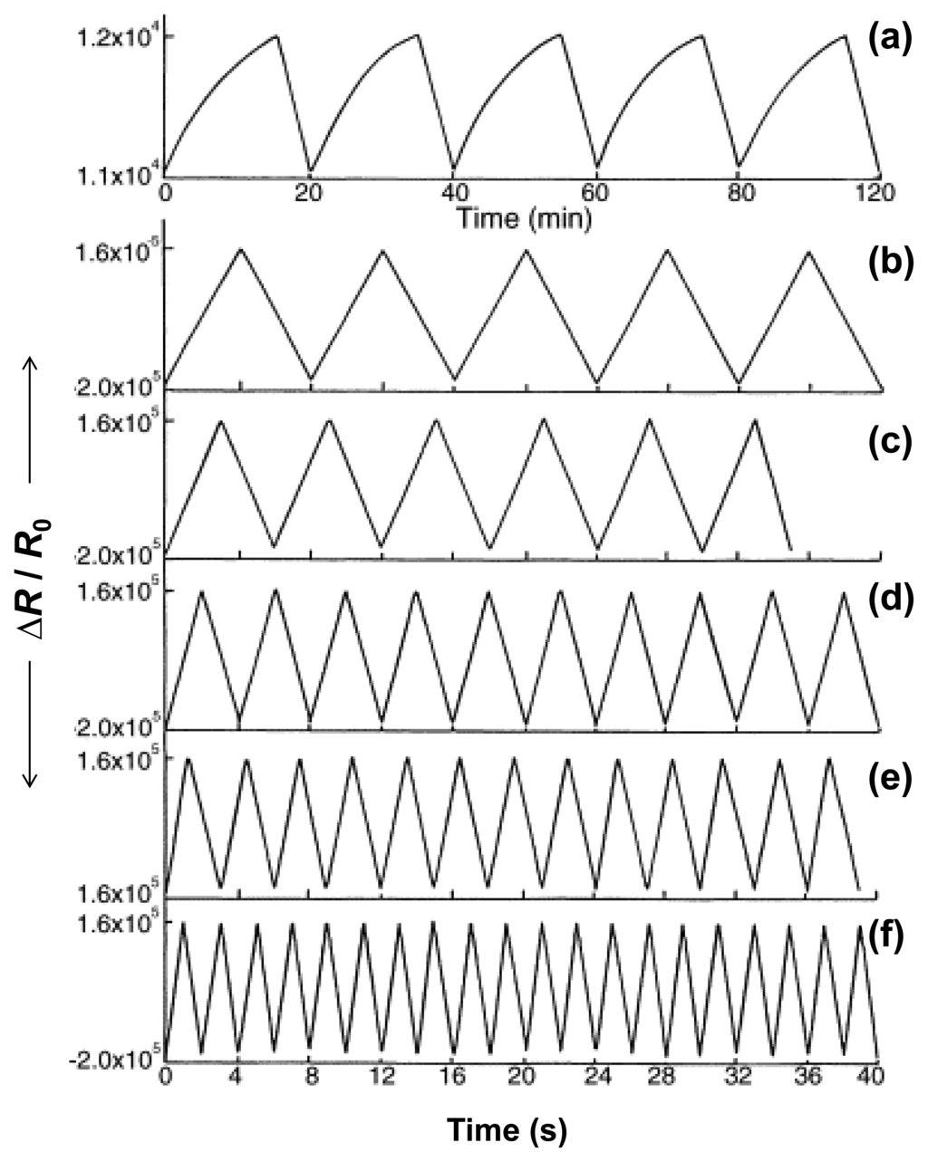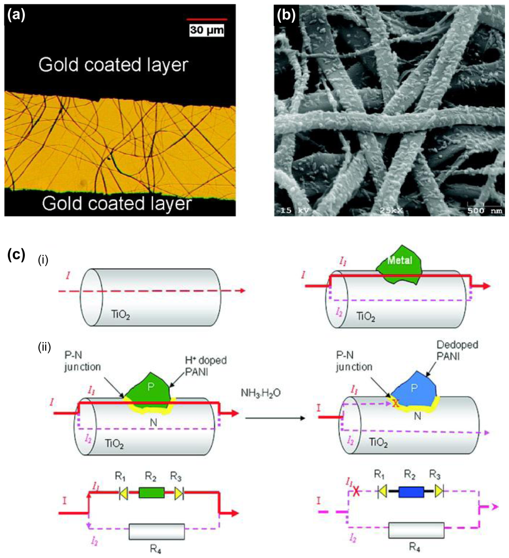 In the detection of ammonia gas, the p-n junctional type as transistor was introduced for the first time. Gong et al. fabricated unique conducting polymer nanograins using PANI and electrospun titania fibers, leading to the ultrasensitive NH3 gas sensor (Figures 11a,b) [60]. They introduced p-n heterojunctions combining p-type PANI and an electrospun n-type semiconductive titania nanofiber using immersing process. Moreover, the chemiresistive ammonia sensor based on titania/PANI nanohybrids was developed with electric current switches that can be operated by the resistance change from p-n heterojunction when NH3 gas is absorbed by PANI nanograins (Figure 11c). Surprisingly, the MDL of chemiresistive sensor was ca. 50 ppt NH3 gas in air, which is 1000 times more sensitive than the best PANI sensor reported in the literature.