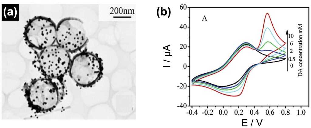 - Feng, X.M.; Mao, C.J.; Yang, G.; Hou, W.H.; Zhu, J.J. Polyaniline/Au composite hollow spheres: Synthesis, characterization, and application to the detection of dopamine. Langmuir 2006, 22, 4384–4389. [Google Scholar]