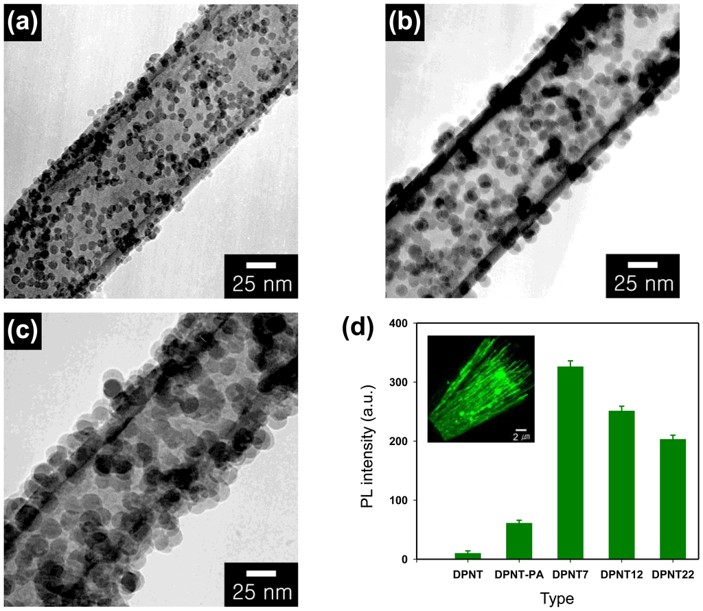 Nucleic acids such as DNA or RNA can affect important protein information in human body. As a results, various DNA analysis have been reported with advanced sensing devices in related applications including infectious diseases, drug discoveries, and clinical diagnosis. One of the attractive DNA sensing systems is electrochemical detectors based on biomaterial-conjugated conductive geometries. Electrochemical DNA sensors showed direct and fast electrical-signals toward target biomolecules, leading to the simple sensing geometries without complex signal transduction equipment and expensive analyzers. Moreover, the hybridized transducers in DNA sensors showed more sensitive and selective sensing performances compared to pristine them. Especially, DNA detectors based on conducting polymer nanohybrids provided excellent electrical properties, resulting that high-performance DNA sensors were constructed. Tian et al. reported stable multilayer films using PANI/mercaptosuccinic-acid-capped gold (MSAG) nanoparticles hybrids by layer-by-layer method [72]. PANI can provide the excellent redox activity by molecular doping and shift their neutral conditions to significant redox position, leading to the excellent electrochemical sensing devices. In this study, the PANI layer was easily stimulated by modified MSAG under no polyelectrolytes conditions and its electroactivity was shifted to neutral pH without polyelectrolytes. Moreover, PANI hybrid layer was functionalized to introduce the amino-terminated DNA catcher probes (NH2-DNA), which can be used for monitoring their hybridization with different DNA target strands under electrochemical methods. Based on the electrochemical impedance spectroscopy (EIS), the surface-charge density of the PANI hybrids increased from the hybridization process with target DNA, resulting that the electrostatic repulsion also increased. Therefore, the comparison between before and after the introduction of target DNA (500 nM) can be monitored with EIS spectra. Jang et al. reported excellent dual-functionalized conducting polymer nanohybrids substrates for molecular-probe and DNA-carrier [23]. They, for the first time, constructed bifunctionalized conducting polymer nanotube hybrids using VDP in ferric chloride-adsorbed alumina membranes with 100 nm pore diameter. Moreover, the conducting polymer nanotubes were also functionalized with carboxylic groups by the polymerization of pyrrole-2-carboxylic acid. Functionalized PPy nanotubes can be easily decorated a photoluminescent molecule, pyreneacetic acid, which silica nanoparticles were employed as the linker. The silica nanoparticles with surface amino groups were first attached to the PPy nanotubes and then pyreneacetic acid was linked with the silica nanoparticles. Furthermore, single-stranded DNA (ssDNA) with a terminal amino group was attached to the residual carboxyl groups of the nanotubes. The resulting PPy nanotube hybrids were characterized with IR spectroscopy, XPS, and electron microscopy. Interestingly, the size of the attached silica-NH2 nanoparticles decreased with increasing number of the nanoparticles, resulting in that the total surface area of silica nanoparticles increased (Figure 14a–c). The PPy nanotubes hybrids with silica nanoparticles were found to have more sensitive responses than only PPy nanotubes owing to the enhanced surface area. The nanotube hybrids showed excellent PL intensity (Figure 14d) and different intensities depending on the size of the attached silica nanoparticles (7 nm > 12 nm > 11 nm). Feng et al. also fabricated DNA sensors using gold/PANI nanotubes hybridized membranes. The PANI nanohybrids were constructed on the glass carbon electrode and utilized as electrochemical sensing geometry to detect the immobilization and hybridization of DNA. The cyclic voltammetry, pulse voltammetry, and electrochemical impedance spectroscopy were introduced to characterize PANI nanohybrids. Based on the DNA probes using PANI nanohybrids, they showed excellent recognition of DNA hybridization under the phosphinothricin acetyltransferase gene (PAT). The DML toward the sequence-specific DNA was 3.1 × 10−13 mol·L−1, which is high-performance DNA sensor compared to conventional DNA biosensors. Moreover, specific recognition and reproducibility of the DNA sensor using PANI nanohybrids were also evaluated.
