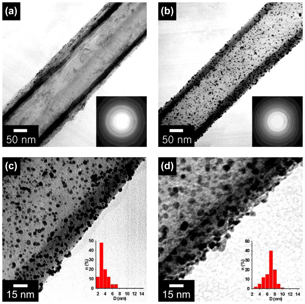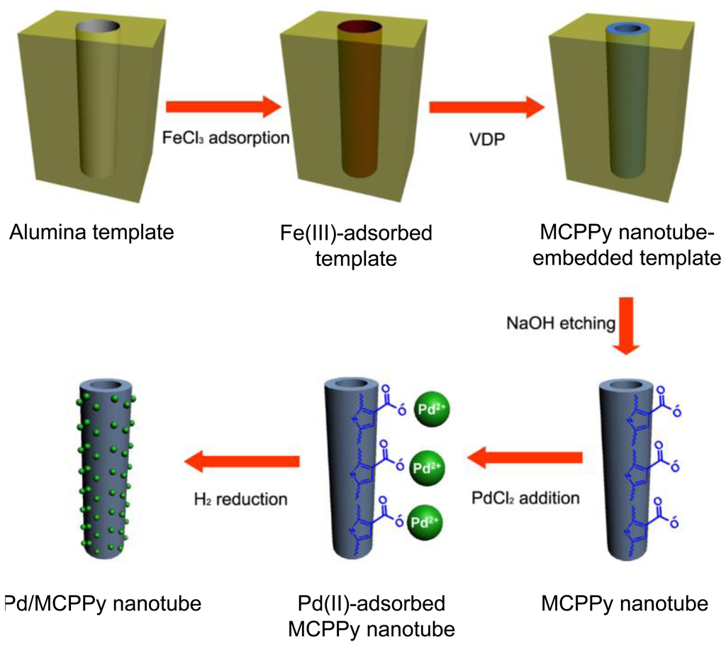There is a notable example of fabricating metal nanoparticles-decorated PPy nanotubes using the above strategy [22]. Carboxylated pyrrole, P3CA monomers were chemically polymerized by ferric chloride within the cylindrical pores of a membrane template and magnetic phases were readily introduced into the nanotubes by precipitation of residual iron salt complexes during the template removal process. The main synthesis steps are represented in Figure 2. Magnetic carboxylated PPy (MCPPy) nanotubes were prepared by vapor-deposition polymerization (VDP) of P3CA monomers in porous aluminum template and subsequent chemical reduction of Fe(III) during the template etching process. The magnetic CPPy (MCPPy) nanotubes provide the anchoring sites for metal cations, thus making it possible to generate Pd nanoparticles on the nanotube surface at room temperature. Figure 3a shows transmission electron microscopy (TEM) image of MCPPy nanotubes with a diameter of ca. 100 nm and a wall thickness of 10–20 nm. The electron diffraction pattern indicated the presence of magnetites because only PPy is amorphous. Figure 3b–d exhibit TEM images of Pd nanoparticles-decorated MCPPy NTs prepared with different palladium salt (PdCl2) concentrations. As the palladium salt concentration increases, the diameter of the formed Pd nanoparticles turned out to increase from 3.6 up to 9.8 nm. It is considered that rapid nucleation relative to growth lead to a small particle size at low concentrations of Pd salt. Figure 3b–d demonstrate that relatively uniform Pd nanoparticles are formed on the surface of the MCPPy nanotubes. The Pd nanoparticles have a narrow size distribution (the inset histograms).