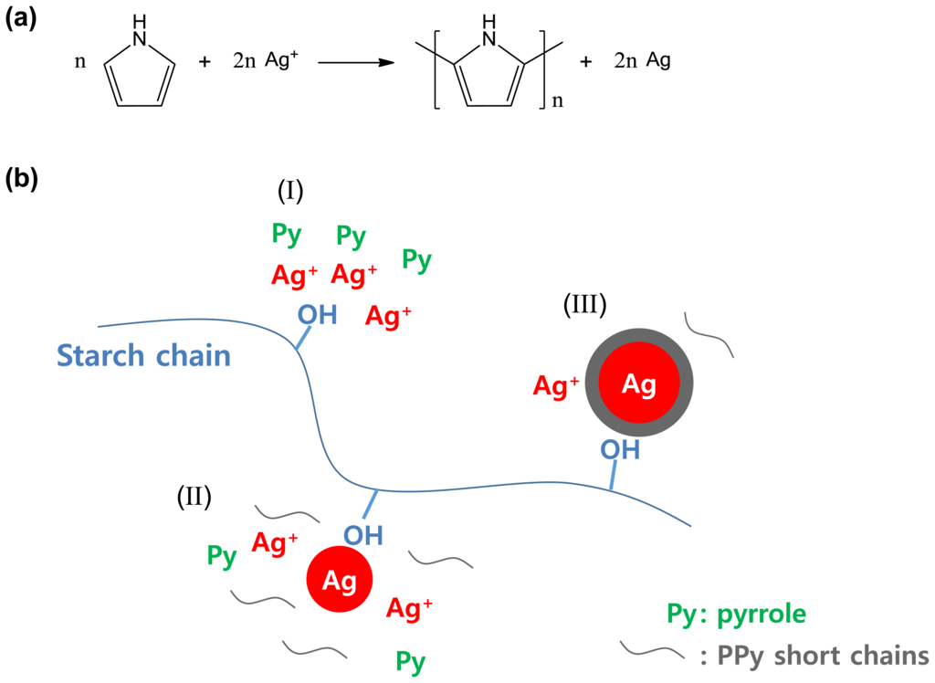 As a recent example, silver-PPy core-shell nanoparticles were readily obtained through the concurrent reduction/oxidation of silver nitrate/pyrrole in the presence of starch stabilizer [30]. The overall formation mechanism of the core-shell nanoparticles is described in Figure 4. First, pyrrole monomers are oxidized by silver cations, yielding PPy and silver atoms simultaneously (see Figure 4a). The polar groups of starch used as a steric stabilizer can act as nucleation sites to generate the core-shell nanoparticles at the initial stage (stage I). At the nucleation sites, silver cations are reduced to atomic silver by pyrrole monomers, whereas the pyrrole monomers are oxidized to pyrrole radical cations (stage II). Thus, the silver nanoseeds are being formed at the nucleation sites and coupling of pyrrole radical cations results in PPy short chains. Owing to the so-called common ion adsorption effect, additional silver cations are adsorbed onto the nanoseed surface that lead to the formation of a PPy shell through subsequent growth of surrounding PPy short chains (stage III). The resulting core-shell nanoparticles were ca. 36 nm in core diameter and ca. 13 nm in shell thickness, respectively. Importantly, those sequential reaction steps for yielding the core-shell nanoparticles are not complicated at all. The two reactants, pyrrole and silver nitrate are subjected to the successive reactions in a reactor to yield the final product, often referred to as one-pot synthesis.