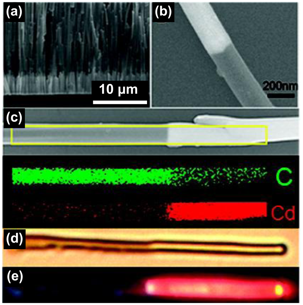 In contrast with most polymers, the conductivity of conducting polymers makes them eligible for various electrochemical tool applications. As a typical example, conducting polymers can be readily obtained through electrochemical oxidation polymerization on electrodes. Electrochemical deposition involves a subsequent reduction of metal ions deposited from a solution onto an electrically conductive substrate. When conducting polymers are used as the conductive substrate, therefore, a variety of inorganic compounds can be introduced into the polymers using electrochemical deposition. Most related studies have used electrochemical co-deposition, for example, such as the electrochemical polymerization of a conducting polymer on an electrode, followed by the electrochemical deposition of an inorganic component. Li and co-workers reported the fabrication of CdS-PPy heterojunction nanowires by electrochemical co-deposition in porous alumina template (Figure 5) [33]. First, CdS was deposited into the cylindrical nanopores of the alumina membrane using CdCl2 and element sulfur as precursors in a dimethyl sulfoxide solution at a current density of 2.5 mA·cm−1. Subsequently, PPy was deposited in 0.1 M LiClO4 acetonitrile solution by applying a voltage of 0.85 V (vs. SCE). Scanning electron microscopy (SEM) images and element mapping demonstrated the formation of the heterojunction nanowires with diameters of 200–400 nm. Similarly, CdS-PANI nanowires and gold-PPy heterojunction nanorods have been also synthesized [34,35].