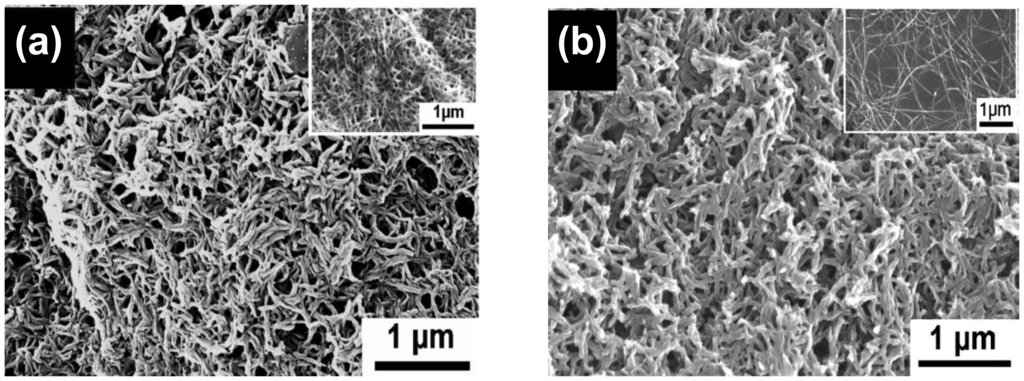 One-dimensional nanostructures could be also obtained through seeding approaches. The Manohar and Zhang groups have also reported interesting results of fabricating PPy and PANI nanofibers using several different kinds of nanofiber seeds [39–41]. Nanofiber seeds such as V2O5 nanofibers and single-walled carbon nanotubes (SWNTs) acted as a reactive template that chemically interact with the monomer prior to the addition of initiator (Figure 6). Employing such nanofibers seeds has resulted in the formation of PPy or PANI composite nanofibers with ca. 20–50 nm, in which the morphology of the final product was dependent on the species, dimensions, and surface properties of seeds.