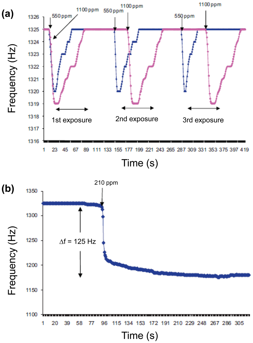 Nerve agents as organophosphate compounds induce the inhibition of serine protease in the nervous system and serious effects in human by reducing the breakdown of acetylcholine. There are various nerve agents. Especially, dimethyl methylphosphonate (DMMP), which is one of the diverse nerve gas simulants, has similar chemical structures with sarin gas that is used as a chemical weapon owing to its extreme potency as a nerve agent. Therefore, diverse technologies, including colorimetric assay, surface acoustic wave, and enzymatic assay, have been developed to detect DMMP gas. Representative researches toward nerve agent gas detection have been made with conducting polymers or carbon nanomaterials because of their excellent conductivity and facile functionalization, showing the high-performance sensing properties [42,44]. Especially, DMMP, which contains phosphoryl groups, can act as hydrogen-bond basicity, so that it easily can accept a proton from functionalized conducting polymer nanomaterials or nanohybirds. Recently, there was an interesting research using conducting polymer/metal hybrids without functional groups. Tiwari et al. fabricated PPy nanohydrids using electrochemical incorporation in presence of a cationic surfactant, cetyltrimethylammonium bromide (CTAB) [45]. Multidimensional PPy/copper phthalocyanine (CuPc)/CTAB/NaClO4 with unique flake-like CuPc substructure on the indium tin oxide substrate was demonstrated with infrared (IR) spectroscopy, cyclic voltammetry, and energy dispersive X-ray (EDX) analysis. Moreover, the flake-like CuPc can provide the enlarged surface area, leading to the higher sensitivity than that of flat structures. The sensing geometry using PPy nanohybrids with flake-like CuPc was developed in order to detect DMMP and toxic gases, which was connected to an acquisition system. This sensor showed significant frequency shift under various DMMP concentrations (Figure 7). Although the sensitivity from the PPy/copper nanohybrids was low compared to multidimensional conducting polymer nanostructures, they showed a possibility of detecting DMMP gases using metal nanohybrids.