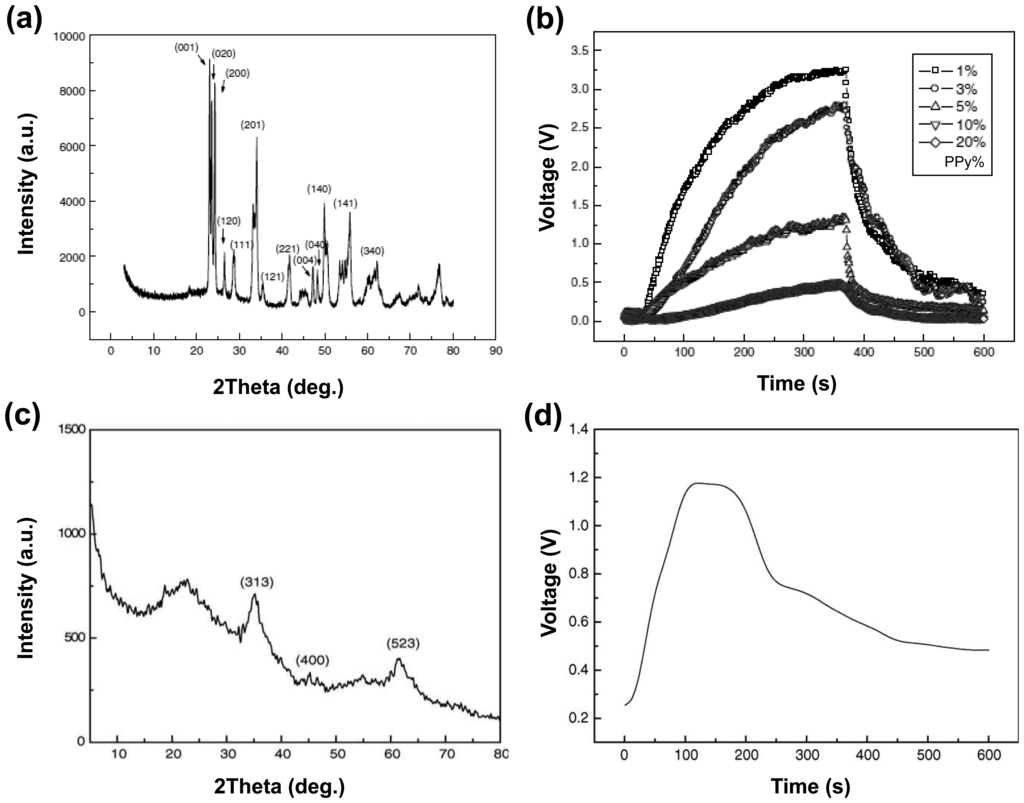 Hydrogen sulfide can interact with PANI via a doping mechanism, which may result in a measurable change in PANI conductivity. However, H2S as a weak acid is partially doped into the polymer backbone, allowing only low sensitivity. To overcome this drawback, Virji et al. demonstrated the concept by incorporating transition-metal chlorides into PANI nanofibers and utilized as transistor for H2S detection (10 ppm) [47]. This is based on the formation of metal sulfide precipitates in metal salt solutions, giving rise to strong acids as the by-product. They provided experimental data to compare the sensing properties between pristine PANI and PANI/metal salts. Moreover, they prepared PANI nanofibers with various metal salts and characterized doping process using coordination of metal cations to the nitrogen atoms. The chemical sensors based on the PANI hybrids were measured the resistance changes upon the exposure to H2S (10 ppm). Also, they characterized the formation of sulfur in the films with EDX analysis. From the experimental results, the CuCl2 as metal source showed the strongest sensitivity compared to Zn and Cd metal salts. Compared to the effect of incorporated transition-metals, in sensing H2S using metal nanohybrids, another one of the important factors is a temperature because the activity of the metal substrates can be sensitive on temperature changes. Geng et al. also prepared PPy nanohybrids mixing mechanically with WO3 and showed excellent H2S detection at low temperature (90 °C) compared with conventional H2S sensors based on hybrids [49]. The PPy nanohybrids were characterized using HRTEM and X-ray diffraction (XRD) pattern, resulting that the average size of WO3 particles was ca. 29 nm calculated with Scherrer equation (Figure 8a). The voltage of the nanohybrid-based sensors was monitored by using a conventional circuit in which the sensor was connected with an external resistor in the testing circuit. In the sensing properties, the PPy nanohybrids showed stable reversibility and high sensitivity depending on the amount of PPy mass percent when operated at 90 °C. Moreover, they demonstrated that the mixing ratios of organic-inorganic hybrids can affect the sensing properties (Figure 8b). In addition, Geng et al. prepared PPy/γ-Fe2O3 nanohybrids using chemical oxidation with Fe(NO3)3·9H2O and used it for the detection of toxic gases [50]. The PPy-based nanohybrids were prepared by simultaneous gelling and polymerization under methoxy ethanol and Fe(NO3)3·9H2O. The nanohybrids were characterized by IR spectroscopy, thermogravimetric and differential thermal analysis, XRD analysis (Figure 8c), and electron microscopy. From these characterizations, the optimized annealing temperature and mole ratios of oxidation were selected and the operating temperature of the PPy/γ-Fe2O3 nanohybrids was studied at 90 °C. Using the PPy nanohybrids as transducer, they showed the sensitivity difference toward 0.1% H2S depending on the different mole ratios of hybrid composition and also demonstrated the maximized annealing temperature vs. H2S sensing properties in the PPy/γ-Fe2O3 nanohybrid system (Figure 8d). From these results, H2S sensors using conducting polymer/metals can be optimized with their kinds, detecting temperature, and annealing temperature.
