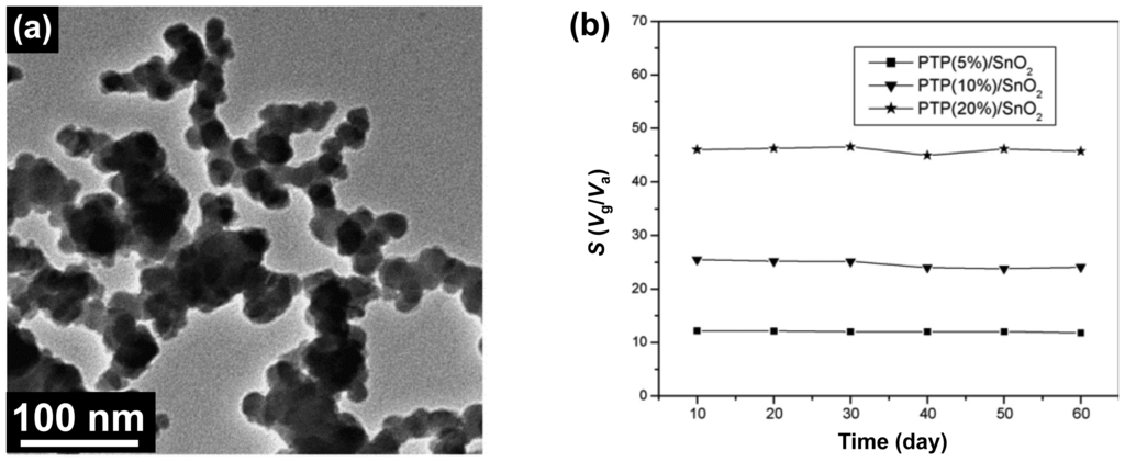 Metal oxides such as SnO2, WO3, and ZnO have been utilized in monitoring NO2 gas [51–53]. However, they have low selectivity and sensitivity at ambient temperature. Therefore, organic-metal nanohybrids were developed to overcome their limitations. Kong et al. synthesized PTh/SnO2 nanocomposites by the in situ chemical oxidative polymerization and applied it for NOx detection [54]. The SnO2 particles were coated with PTh shell which was several thickness in nanoscale (Figure 9a). They found that the sensitivity and selectivity can increase by controlling PTh mass percent (1%, 5%, 10%, 20%, and 30%) in PTh/SnO2 nanocomposites. Based on the effects of p-n heterojunction between PTh and SnO2, the minimum detectable level (MDL) of nanocomposites toward NOx gas was ca. 10 ppm at room temperature, which was higher than pure SnO2. Moreover, the stability of PTh/SnO2 (PTh mass: 5%, 10%, and 20%) sensor was calculated during two months at room temperature, by which the enhanced stability was confirmed (Figure 9b). This NOx sensor using PTP/SnO2 nanocomposite operated high temperature (∼90 °C), while WO3-based transistors can detect NOx at low temperature. Using similar fabrication process, PTh/WO3 nanohybrids were also designed by Huang et al. and characterized with TEM, XRD analysis, and thermo-gravimetric analysis [55]. This nanohybrid showed higher thermal stability than pure PTh, leading to the utilization as sensing materials in chemical sensors. The MDL of the PTh/WO3 nanohybrids toward NO2 gas was a ppm level at low temperature. They demonstrated several critical factors, including the operating temperature and PTh contents, in conducting polymer/metal oxide-based chemical sensors. In this study, the 10 wt% PTh/WO3 nanohybrid showed the highest response at low operating temperature of 70 °C. Moreover, the NOx sensor at room temperature was demonstrated using PANI/In2O3 nanocomposites and they displayed high sensitivity. Sadek et al. created excellent NO2 gas sensor using PANI/In2O3 nanofiber composites [56]. The nanohybrids were fabricated by chemical oxidative polymerization of aniline in the presence of finely divided In2O3. The high-performance sensing geometry was developed by deposition of nanohybrids on surface acoustic wave (SAW), leading to the fast response and recovery times with good repeatability at room temperature. The conductivity of PANI/In2O3 increased with NO2 exposure, which indicates that NO2 gas can act as a dopant for the PANI/In2O3. Interestingly, based on this sensing mechanism, the MDL of PANI/In2O3 nanohybrid was ca. 510 ppb and rapid response/recovery time was calculated.