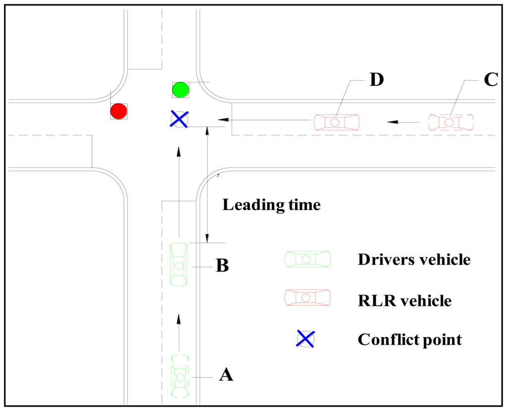 Studies which were focused on the key technologies [7,8] and the structural design [9–11] of ICWS have been conducted recently. For instance, Yang et al. [12] designed a kind of intersection collision warning system using wireless communication technology which is capable of estimating specific collision points according to the geometric positions, directions, speed and other parameters of vehicles. Then, the warning information will be delivered to drivers in case of potential collisions by the system. Dedicated short-range communication technology has been accepted as one of the wireless technologies most suitable for automatic crash prevention because it enables direct vehicle-to vehicle and vehicle-to-infrastructure communications in very short time frames [13]. The emergence of vehicle infrastructure integration (VII) provides ideas and methods designed specifically for reducing the chance of being involved in RLR collisions. With such a system, warning technologies for addressing RLR collision problems are being developed, which allow drivers to monitor the road situation by means of a series of detection and sensing devices. If the system detects any possible RLR vehicles, warning information is then posted to drivers in order to promote their attention to the hazards from RLR vehicles. The posted warning information is committed to provide effective suggestions and thus assist drivers in taking appropriate response actions for avoiding the potential collisions with the RLR vehicles. Nekoui et al. [14] presented a design of intersection collision warning systems based on VII. The systems consist of roadside and on-board units, in which appropriate alarm messages are disseminated by the roadside unit. It was designed to predict a potential collision at the intersection and notify endangered vehicles of the moving car which is about to cross the red light. The experimental results showed that the system is effective at avoiding RLR collisions.
