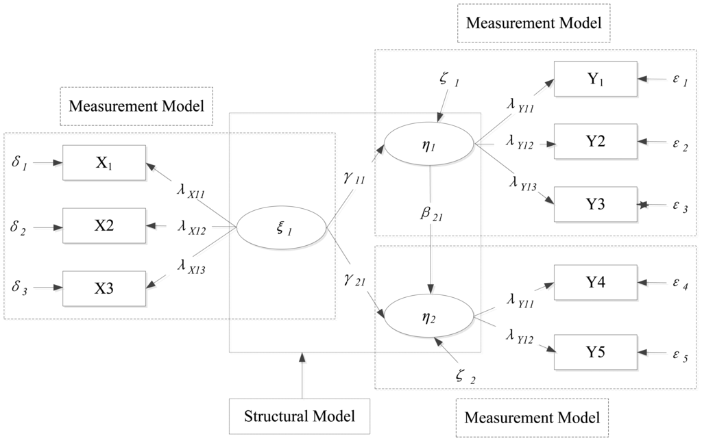 SEM indeed is a linear-in-parameter multivariate statistical modeling technique which combines factor analysis and simultaneous equation models. The relationship among observed variables, latent variables (measured or described by some manifest indicators) and disturbance variables/error variables can be examined, thus making it possible to capture the indirect, multiple, and reverse relationships among numerous variables [27]. Actually, as a variable can be an explanatory variable in one equation but a dependent variable in another equation, ‘endogenous’ variable and ‘exogenous’ variable are applied to differentiate them. In SEM graph, paths that are symbolized by arrows point toward exogenous variables and depart from the exogenous variables [28]. Endogenous variables can be influenced by exogenous variables directly or indirectly [29,30].