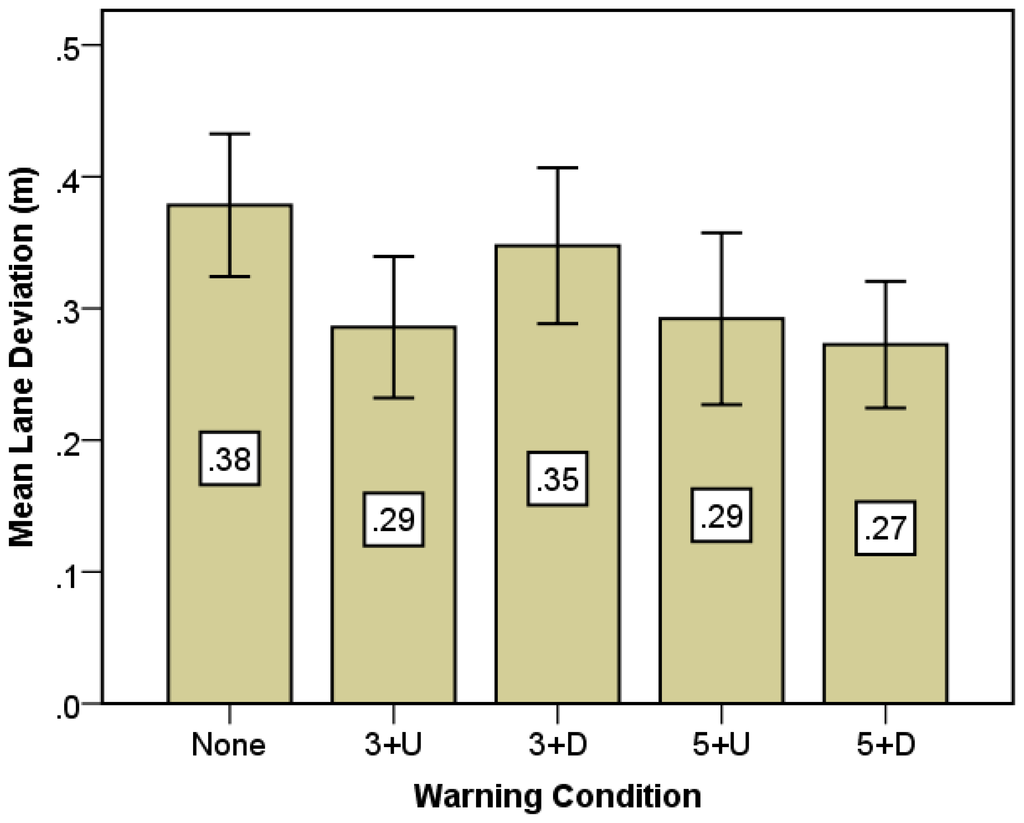 Figure 7 shows the mean lane deviations for different warning conditions. The lane deviation distance in the case of without warning is the largest among the five warning conditions. If drivers received the warning information in advance, they may have sufficient time to finish the deceleration, and thus do not need to rely on the steering wheel to avoid a collision. The horizontal deviation distance by steering was found to be smaller with early warning lead time compared to late warning lead time in general. The result indicates that the early warning can help drivers more confidently take a braking action to avoid collisions than the late warning. Additionally, for 3 s warning lead time, warning without direction information makes lane deviations smaller than the directional one (0.29 vs. 0.35 m). This was consistent with the maximum deceleration analysis as maximum deceleration with directional information is smaller than without in the case of the 3 s warning condition.