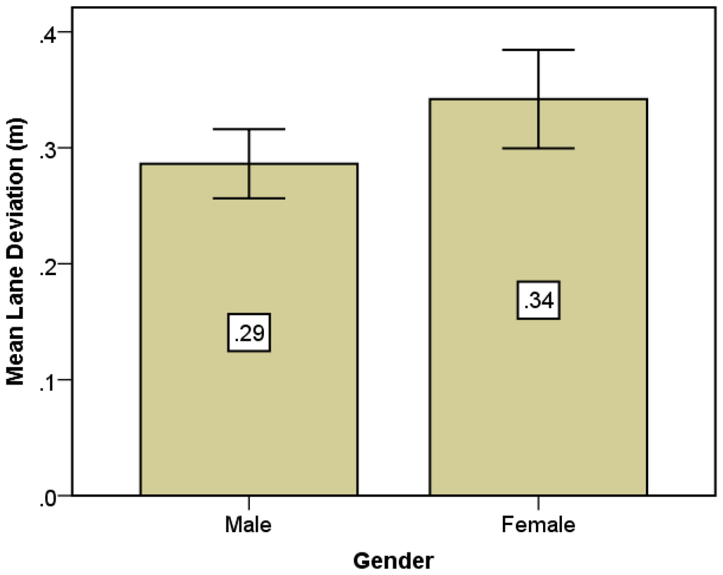 Additionally, Figure 8 shows the difference was affected by gender. It was found that lane deviation of the female group was larger than the male one (0.34 vs. 0.29). The result suggests that the female drivers may panic more than male drivers in case of an emergency.