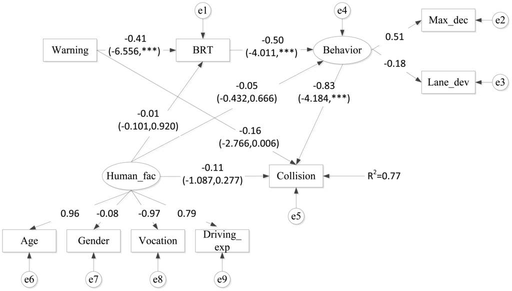 In order to analyze the causal relationships between BRT and the other two variables of the driving behavior as well as the entire interaction among warning conditions, BRT and results of collision avoidance, a SEM was built for this purpose. In the SEM model, brake reaction time is assumed as a variable directly influenced by the warning conditions and that further affects the behavior. According to the output results of SEM model shown in Figure 8, it was found that the effect of warning on the final collision rates was divided into direct effect and indirect effect. Behavior is the most significant factor that negatively affects the collision (factor loading = −0.83, P < 0.001). Warning has a negative impact on BRT (factor loading = −0.41, P < 0.001), which indicates BRT can be decreased with warning information provided in the vehicle. Therefore, BRT was found to have a negative direct impact on behavior, suggesting shorter BRT leads to larger maximum deceleration and smaller lane deviation indirectly. It therefore implies that shorter BRT would lead to drivers' action of decelerating and lateral lane control, and larger maximum deceleration and smaller lateral lane deviation are able to effectively decrease the chance of collisions with RLR vehicles. In addition, warning also has a direct effect on collision occurrence (factor loading = −0.16, P = 0.006). Compared to the indirect effect of warning on collision occurrence (from warning to BRT to behavior then to collision), the most impact of warning condition on final collision occurrence or not was mostly contributed by the indirect effect. Finally, with the warning information, chance of collisions can be greatly reduced, which is consistent with the previous studies [32,34].