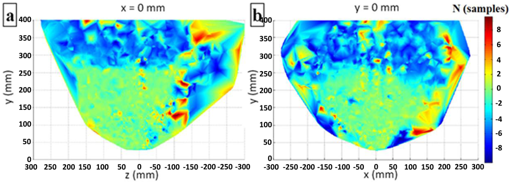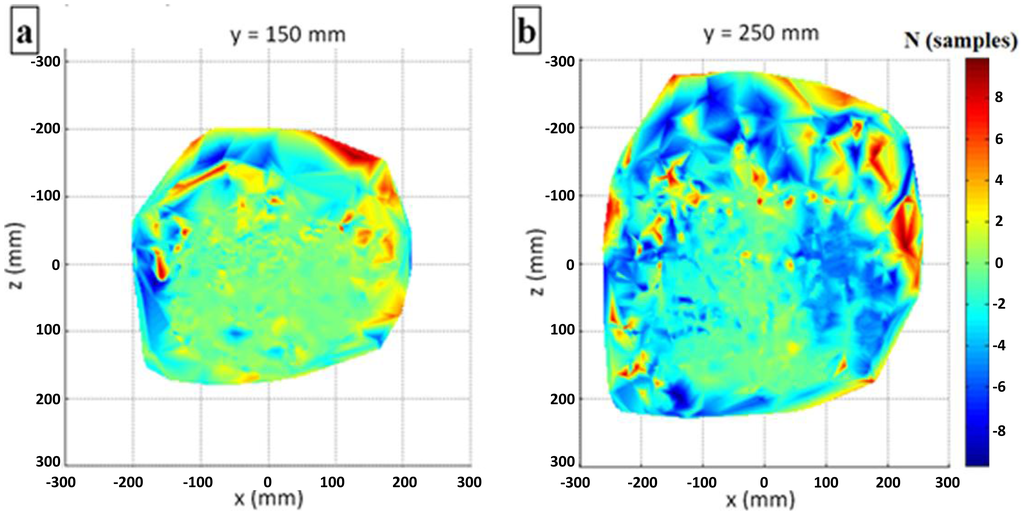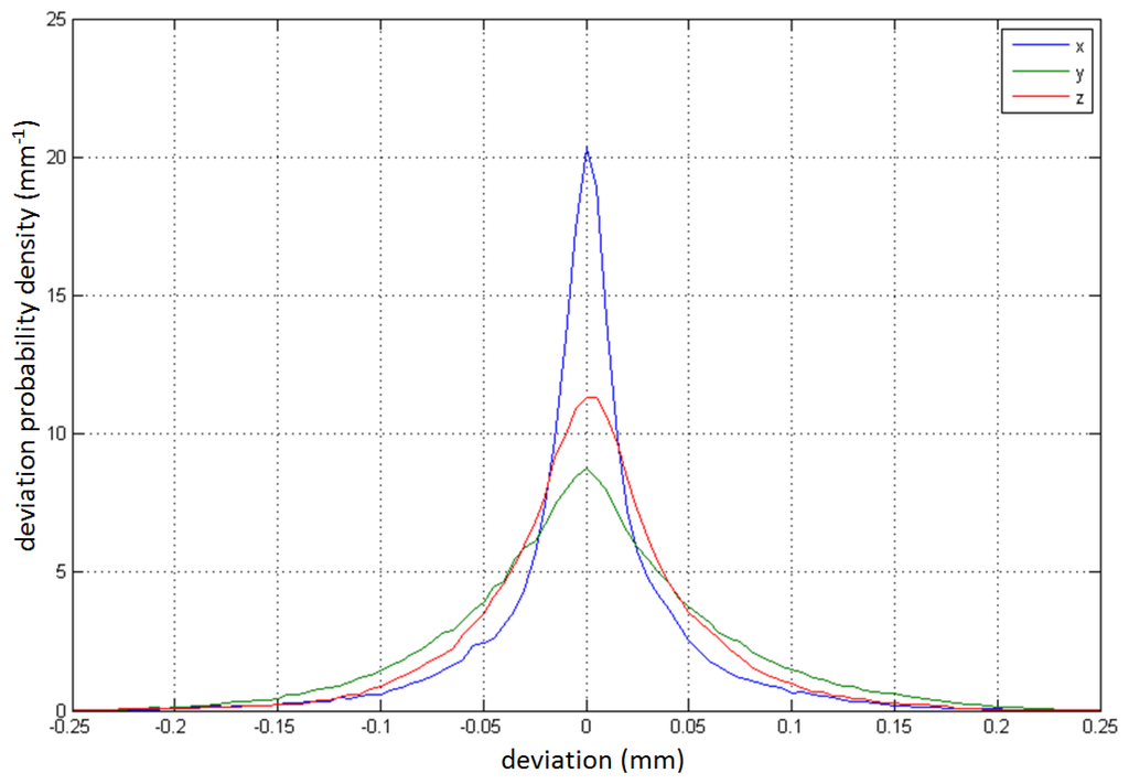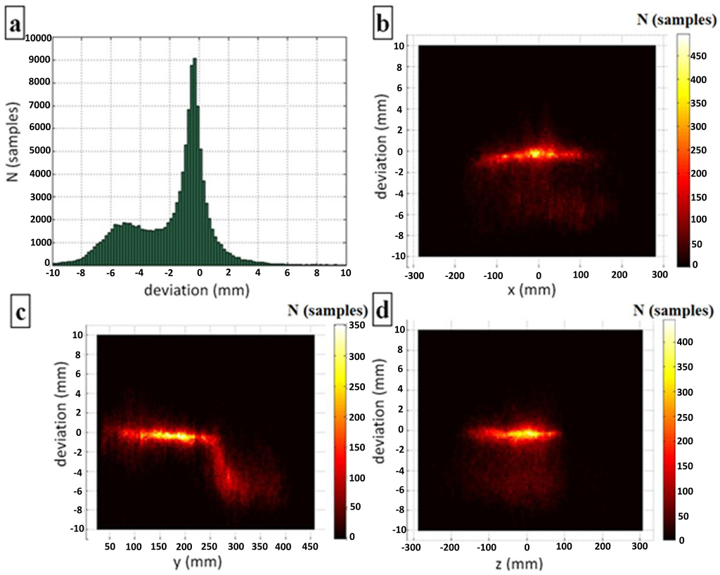 The most interesting phenomenon, which can be noted in Figure 10a, is the non-Gaussian deviation distribution, which was not expected. In addition the global peak at a deviation of approximately 0 mm, another local peak is evident at a deviation of approximately −5 mm. Further analysis shows (Figure 10b–d) that this phenomenon originates in the measurements taken at y > 250 mm over the entire covered area of the x-z plane (−250 mm < x, z < 250 mm).