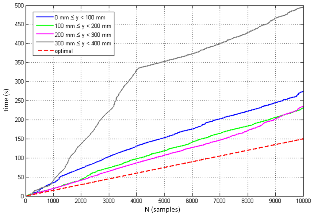 Figure 13 displays the controller's sampling performance when tracking moving objects in four different layers above the controller. The red broken line indicates the optimal sampling performance defined with a constant sampling period of 15 ms, which corresponds to the minimum time interval between two consecutive samples logged in the dynamic measurements. The figure indicates the best sampling performance between the heights of y = 100 mm and y = 300 mm, with significantly reduced efficiency above this height.