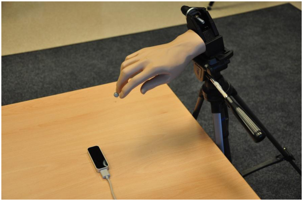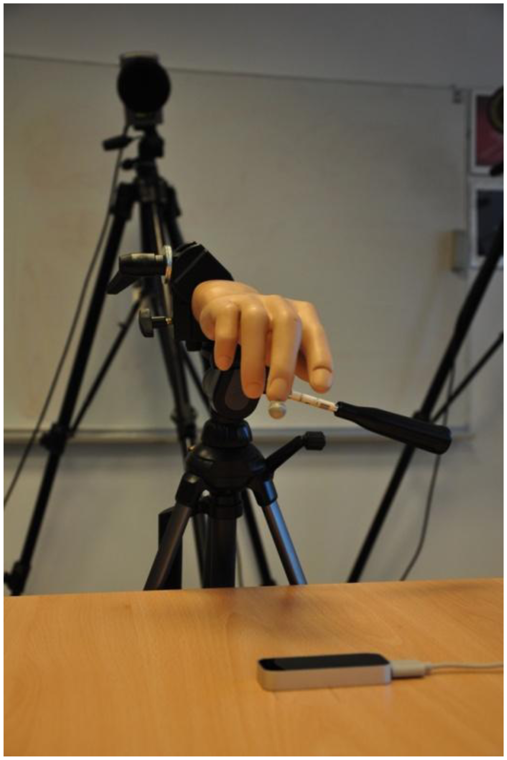 Our pre-experiment trials indicated the controller's inability to track static objects that do not resemble the human hand. We can only speculate that this limitation is due to the controller's internal algorithms, as they are protected by patents and therefore not publicly disclosed. A pointed object, such as a pen tip (used for tracking in []), was successfully tracked only if constantly in motion. When it was stationary and mounted on a stand, it was successfully tracked for only approximately 8–10 s. After this period of time, the measurement was automatically stopped by the controller. Therefore, a plastic arm model was used (Figure 2) instead of a simpler object.