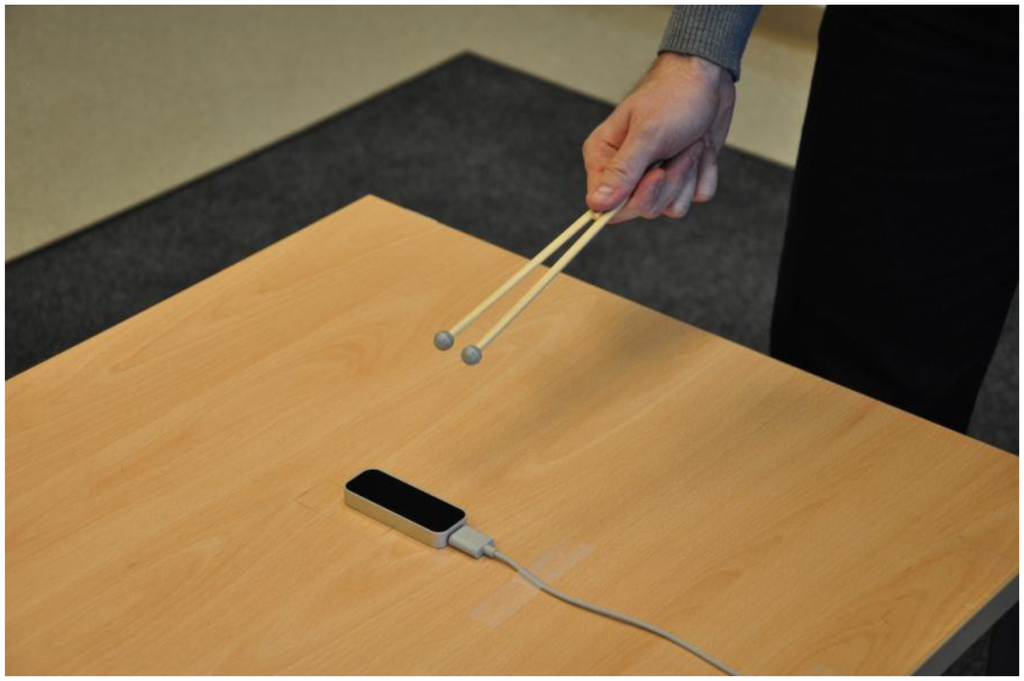 For dynamic measurements, the tracking objects were moved around the sensory space with an approximately constant speed of 100 mm/s. Instead of the plastic arm, a special tool was used to mimic two human fingers. It consisted of two wooden sticks with markers fixed together to form a V-shape (hereafter: “the V-tool”) (Figure 4). This tool provided a constant distance between the two tracked objects, which was used to evaluate the tracking performance. It was perfectly tracked by the controller and the reference system simultaneously. The exact distance was acquired using the reference system (d = 21.36 mm, stdd = 0.023 mm). The arm model with five fingers proved to be very impractical for this type of measurement, as the controller usually tracked the five fingers as five individual points that could not be identified separately. It was therefore almost impossible to identify the results for two selected fingers and calculate their inter-distance.