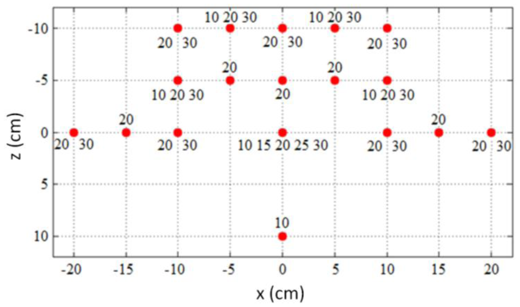 The 37 reference locations where static measurements were performed are shown in Figure 5. The locations of the reference points were selected systematically to cover the majority of the sensory space of the controller. The number at each location in the figure indicates the height (the position on the y axis in cm) at which the individual measurements were taken. The actual measurements were taken close to the reference point in the measurement grid with an offset less than 5 mm. At least 4,000 samples were measured at each location. A total of 214,546 samples were obtained for the entire sensory space.