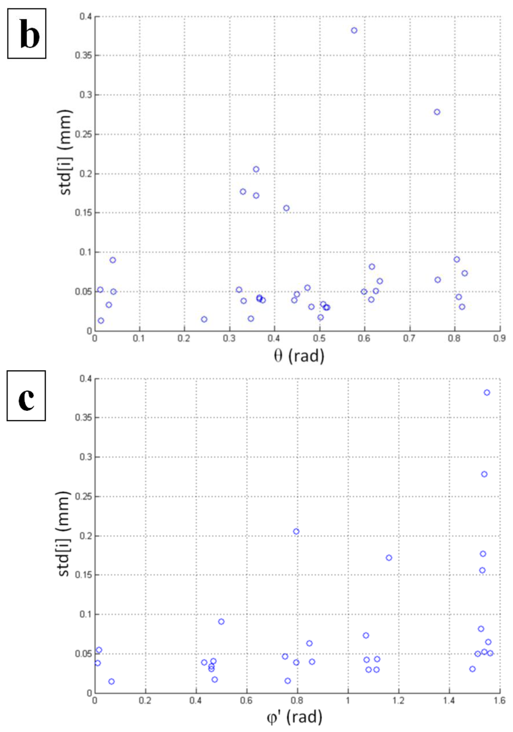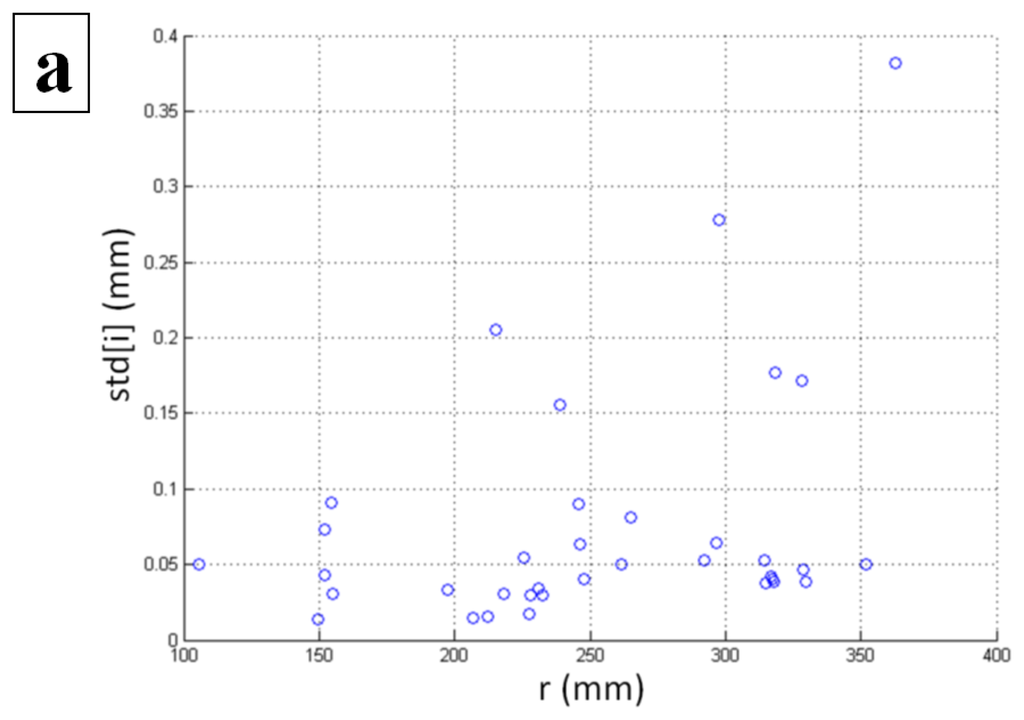 Our further study was focused on the determination of the spatial dependency of the standard deviation of the static measurements. For this purpose, a spherical coordinate system was used instead of the Cartesian coordinate system. The following figures (Figure 7) show the impact of the radius (r), inclination (θ), and azimuth (φ′) on the standard deviation. As the angle φ′ is not defined for the y axis, the five locations above the coordinate origin with x = 0 and z = 0 were excluded from the analysis involving the azimuth angle.