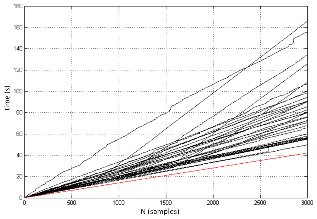 We also analyzed the sampling performance and sampling frequency of the controller. Each measurement of the controller was logged with the corresponding absolute timestamp, which enabled us to determine the exact time gap between two sequential samples and to calculate the corresponding sample frequency. Figure 8 demonstrates the progress of the measurements and the total time required to track the initial 3,000 samples for each of the 37 measured positions. It can be seen that sample frequency is very unstable and varies from measurement to measurement, and also within individual measurement. The minimal logged period between two samples was 14 ms (corresponds to sampling frequency 71.43 Hz). The red line at the bottom of the figure demonstrates the prediction of optimal sampling performance based on the highest measured sampling frequency. Figure 9 shows the distribution of the time intervals between two consecutive samples involving all 37 positions. The mean sampling frequency was 39.0 Hz. The standard deviation was 12.8 Hz.