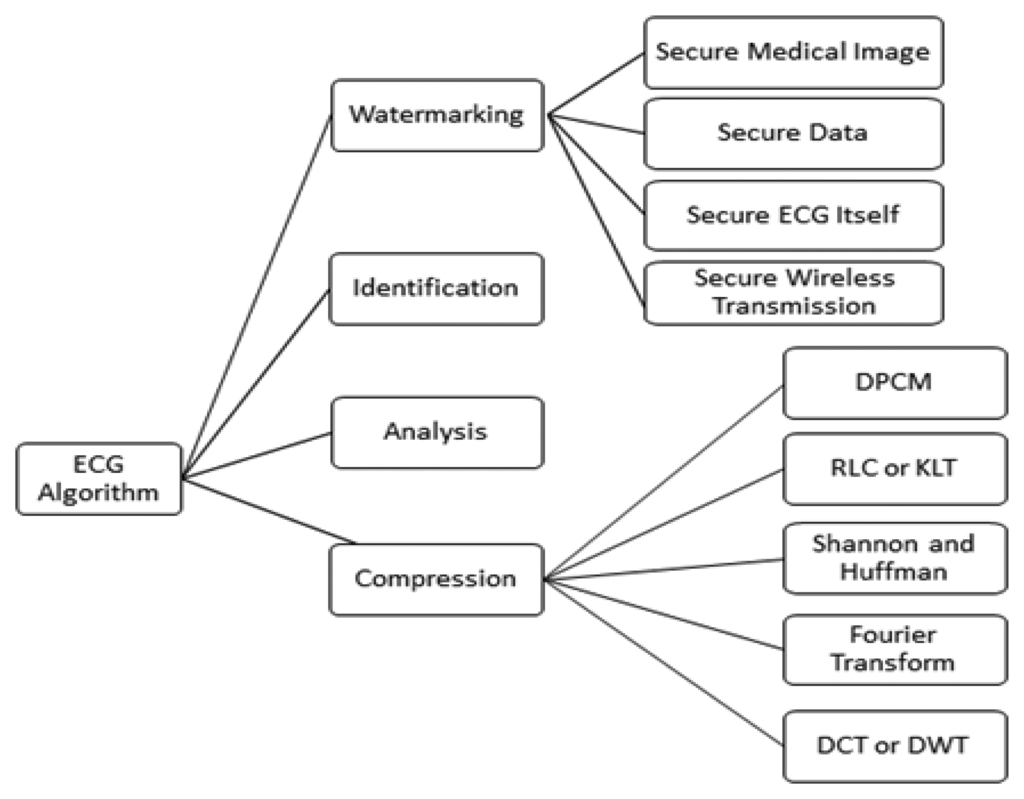 At present, from the watermark point of view, research on the protection of ECG information is still in its infancy, although there are some research studies, shown in Figure 1, related to the watermarking of ECG signals, and with the use of wavelet transform based digital watermarking encryption technology []. Therefore, research in this field has great potential for the researcher. The existing research may be divided several categories.