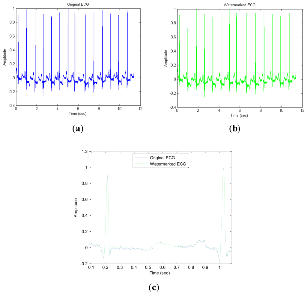 The first application is the digital watermark technology used in medical images. This application proposes a novel blind watermarking method, by embedding a secret key into the medical image of ECG signals. The second is a sensor network-based ECG monitoring system. ECG signals are watermarked with patient biomedical information to confirm patient/ECG linkage integrity []. The third application is wavelet transform-based ECG digital watermarking technology. In ECG signals, the energy is concentrated in QRS complex waves [], so the selection of wavelet coefficients for concealment should avoid causing the QRS complex waves to distort obviously. The last application is ECG transmission in a wireless network. This paper proposes the use of digital watermarking to ensure the safe transmission of ECG signals in a wireless network []. A low frequency chirp signal is used to embed the watermark, which is a 15-bit digital code assigned to the patient. The characteristic of the proposed watermarking scheme is that the embedded watermark can be fully removed by the receiver due to the blind recovery feature of the watermark []. Dey et al. [] proposed a novel session based blind watermarking method with a secret key by embedding a binary watermark image into the ECG signal. In addition, the “P Q R S T”-peaks are marked and stored over the entire ECG signal and the time interval between two consecutive ‘R’-peaks, and intervals between other peaks, are measured to detect anomalies in the behavior of the heart. However, these two methods are non-blind. Ayman and Ibrahim proposed a wavelet-based steganography technique which combines encryption and scrambling technique to protect patient confidential data. The proposed method allows the ECG signal to hide its corresponding patient confidential data and other physiological information [].
