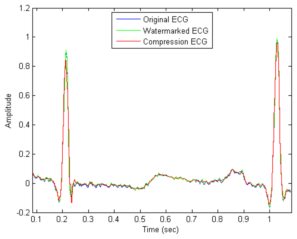 An ECG reflects the process of the electrical activity of the heart, which can be taken as a reference for the study of cardiac function and cardiac pathology []. With an ECG signal, we can analyze and identify various arrhythmias, and understand the degree and development of myocardial damage, as well as the structure and function of the atrium and ventricle. Besides, it is necessary to decrease the demand for the ECG data storage capacity and data transmission bandwidth []. Accordingly, we integrated the quantization based digital watermarking with a new compression method, which is used to watermark the ECG signal and compress the data, while allowing the watermark to be verified. The watermark can ensure the security of the ECG signal and enable it to be restored to its original state. At the same time, we proposed a wavelet compression method to achieve lossy compression of the ECG signal. By removing the high frequency portion under different wavelet basis, we can ensure the compression rate and accuracy. The compression rate is around 1.96. After watermarking and compression, it can be aligned for transmission. On the receiving side, the data decompression and the watermark extraction can then be finished. In summary, we make the following contributions: we integrate electrocardiogram digital watermark encryption and a compression algorithm based on an orthogonal wavelet domain, which has never been researched before.