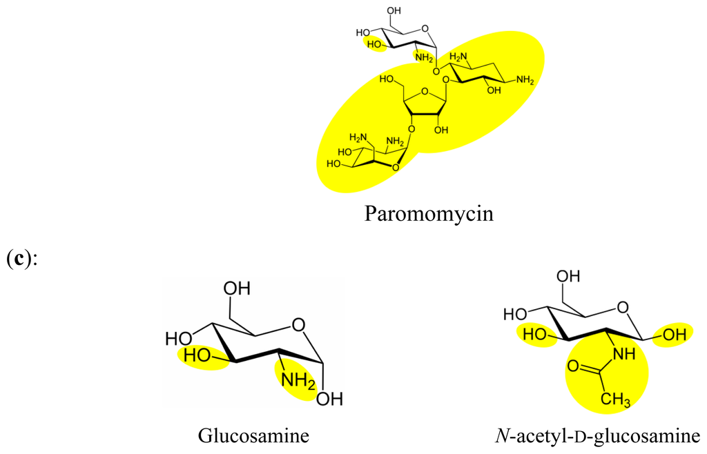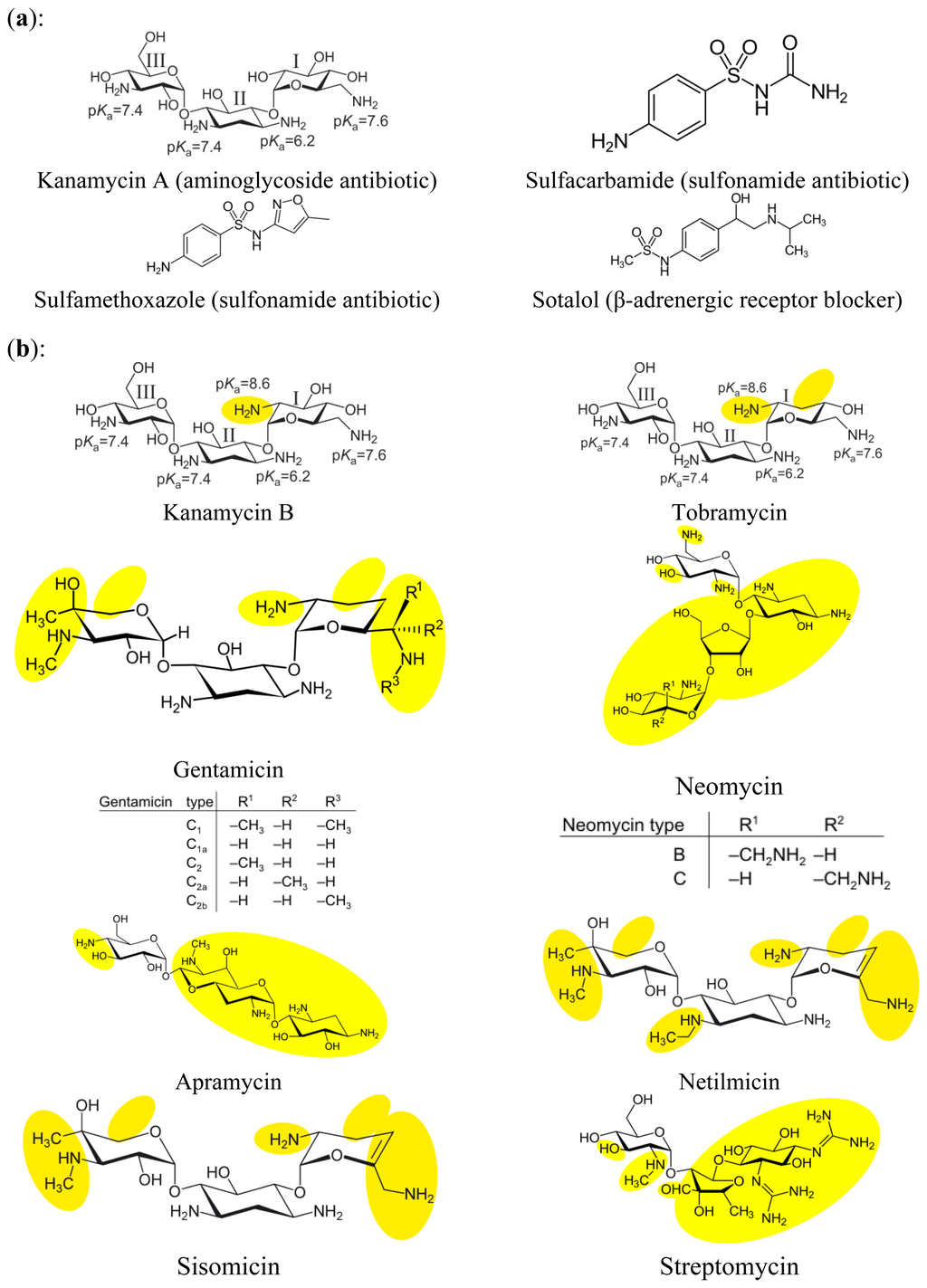 Aminoglycoside antibiotics were discovered in the 1940s and are to date the most commonly used antibiotics worldwide thanks to the combination of their high efficacy with low cost even though they have serious side effects of renal and auditory toxicity. Aminoglycoside antibiotics are low-molecular-weight molecules of approximately 300–600 Daltons. All natural and semisynthetic aminoglycosides share a similar structure consisting of several, usually three, rings. These rings are cyclitols (a saturated 6-carbon ring structure) and five or six-membered sugars that are linked via glycosidic bonds. Aminoglycoside antibiotics have a broad antibacterial spectrum and they are effective against gram-negative bacteria. They show bactericidal properties, i.e., they are able to kill bacteria and not only to prevent their growth [].