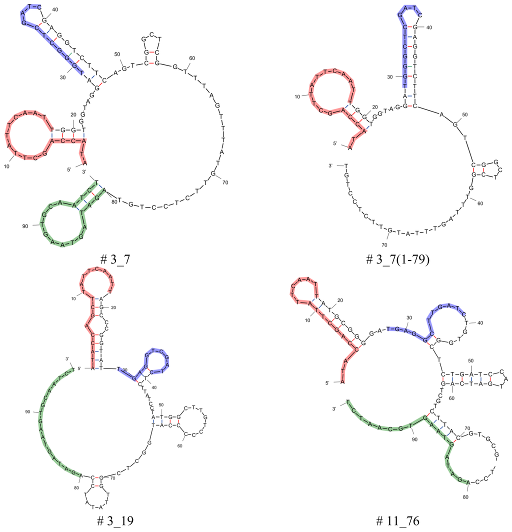 Considering the primary sequences in Table 1 it should be noted that the original docking sequence (TGAGGCTCGATC, highlighted in blue) of aptamers # 3_19 and # 3_7 is altered during the Capture-SELEX process compared to the originally designed sequence. This is most likely a concession to the design of the SELEX procedure as there is a selection pressure towards docking sequences that are less stably attached to the capture oligos as described in detail in []. For the analysis of the secondary structures of the six aptamers chosen from [] and the secondary structures of their truncations the free-energy minimization algorithm using the web based tool mfold was used (Figure 2).
