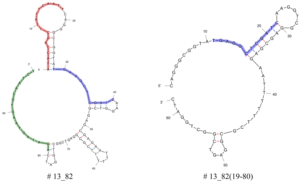 - Zuker, M. Mfold web server for nucleic acid folding and hybridization prediction. Nucleic Acids Res. 2003, 31, 3406–3415. [Google Scholar]
