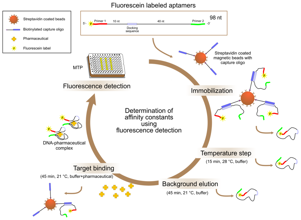 Unbound oligonucleotides were removed by washing the beads nine times with 500 μL selection buffer. In the temperature step all of the remaining unhybridized oligonucleotides or weakened DNA duplex structures were eliminated by incubation of the DNA-bead-complexes in 500 μL selection buffer at 28 °C for 15 min with mild shaking and subsequently washing seven times with 500 μL selection buffer. The following incubation of the DNA-bead-complexes in 300 μL selection buffer at 21 °C for 45 min with mild shaking served as control for background elution of hybridized oligonucleotides from the beads caused by the incubation procedure. After seven additional wash steps in 500 μL selection buffer, the DNA-bead-complexes were incubated at 21 °C for 45 min with mild shaking in 300 μL solution of the respective pharmaceutical to be tested with a concentration of 1 mmol L−1 in selection buffer. During this target binding step, oligonucleotides (aptamers) were released from the DNA bead complexes due to an affinity induced structure switch into a specific three-dimensional structure allowing binding of the aptamer to the target molecule. They could be collected in the supernatant after magnetic separation of the beads.