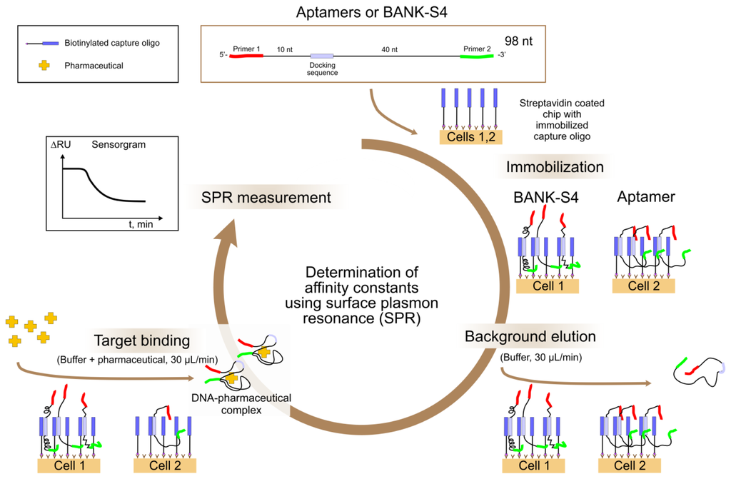 In addition to specificity tests using fluorescence detection, affinity tests were performed using a surface plasmon resonance (SPR) system (Biacore X 100, GE Healthcare), see Figure 4. The surface plasmon resonance measurement is a very sensitive label free detection method which allows real time and quantitative monitoring of binding events at a sensor surface. In our case, aptamers were immobilized via capture oligo at the sensor surface and the release of the aptamers caused by binding to the target added was measured.
