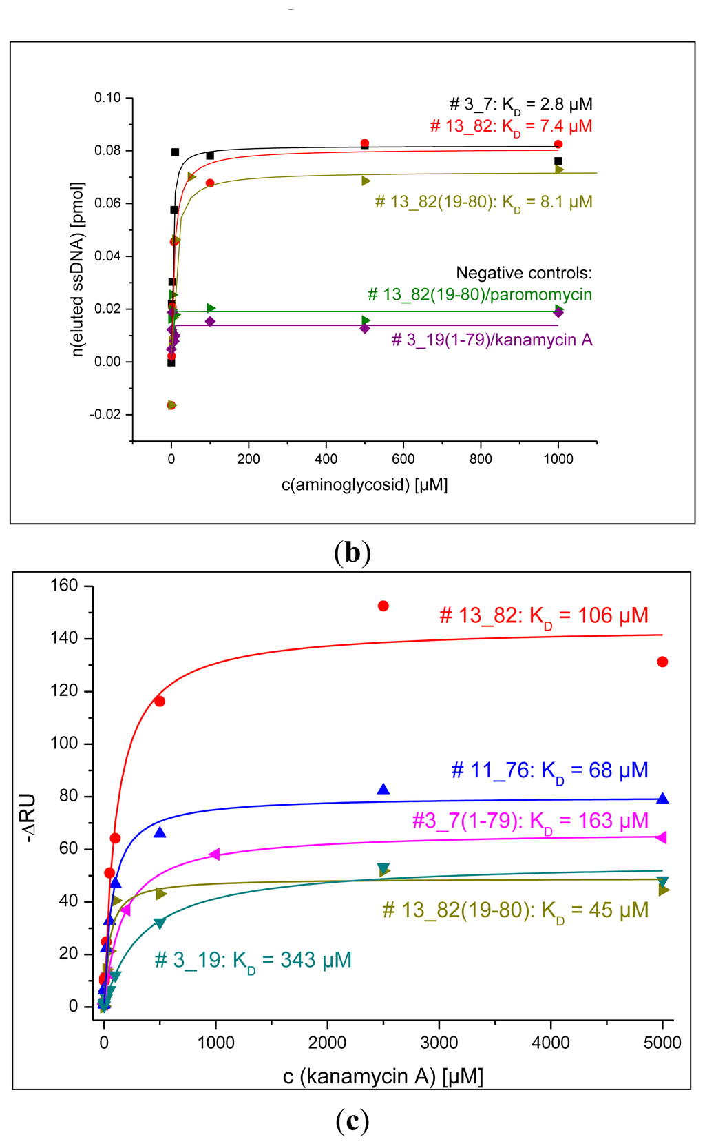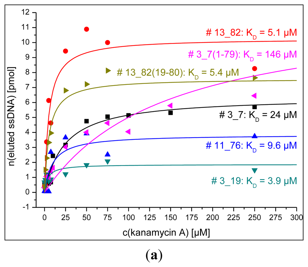Song et al. developed a DNA aptamer for kanamycin using affinity chromatography with kanamycin-immobilized sepharose beads which exhibited affinities for kanamycin A, B, and tobramycin in the nanomolar range []. The RNA aptamers for aminoglycoside antibiotics developed by Goertz et al. using an automated selection protocol have dissociation constants that also lie in the nanomolar range []. Kwon et al. found RNA aptamers for kanamycin B that showed high nanomolar affinity to the targeted aminoglycoside using surface plasmon resonance and fluorescence anisotropy techniques [].