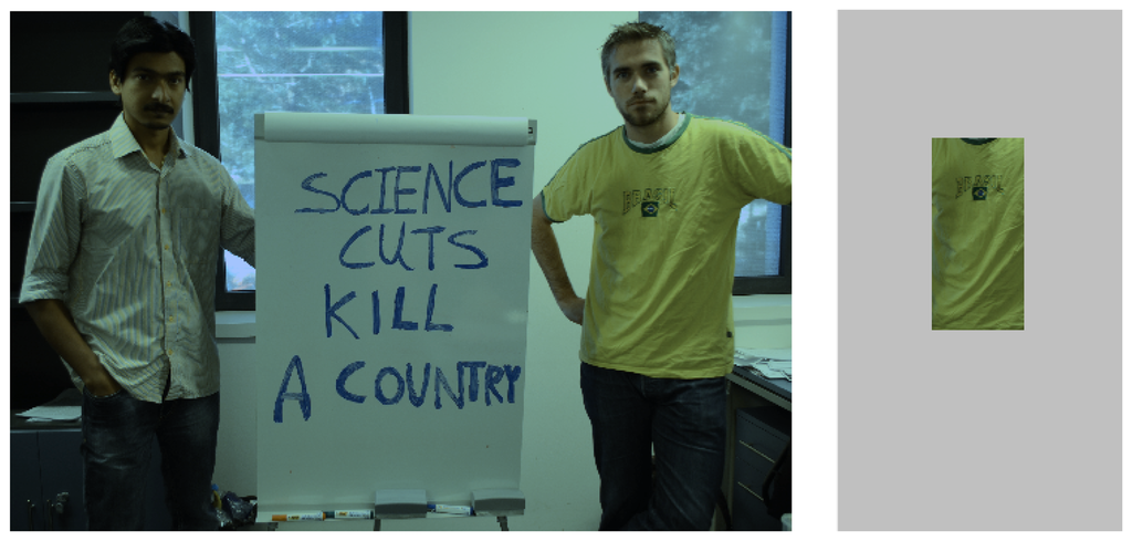 Color constancy is usually defined as the effect whereby the perceived or apparent color of a surface remains constant despite changes in intensity and spectral composition of the illumination [1]. An example is shown in Figure 1, where we are able to perceive the t-shirt of the man in the right as yellow; however, if we isolate the t-shirt we perceive it as green. Some reviews on color constancy have been published recently [1–3].