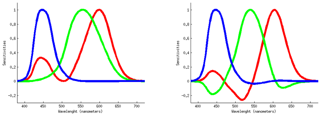 Finlayson et al. [15] called this approach “spectral sharpening” since the new sensors responses are sharper than the original ones. We should note that other authors had previously suggested a similar idea [16]. Figure 2 compares a set of originals sensors with their sharpened version. The remarkable and useful conclusion of the spectral sharpening work was that, even for a broad-band sensor system, a diagonal matrix model of illumination could be used to solve the computational color constancy problem.