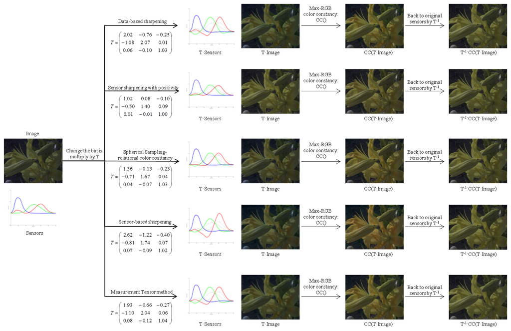 An example of the use of spectral sharpening can be seen in Figure 3. In this figure, an original image that presents a blue cast is seen under the CMF color matching functions. In order to apply diagonal color constancy and remove the blue cast, a linear transform T is computed by 5 different methods (that will be explained later in this section). Then, for each method, the pipeline works as follows: (1) a change of basis is performed by the linear transform T; (2) a method for diagonal color constancy (MaxRGB in this case) is applied to the new basis image; (3) the image is converted back to the original sensors by T−1. The different T matrices have been obtained using the Planckian illuminants and the whole set of reflectances from [17].