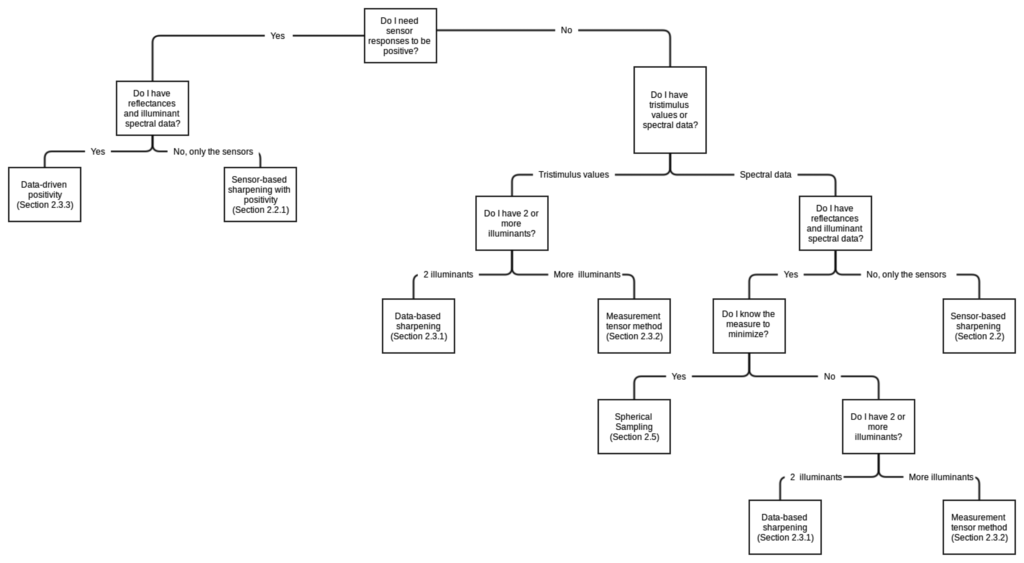 Many cameras do not have sensors that match the above specifications. Therefore, different methods have tried to search for a linear combination of the original sensor responses in order to force them to accomplish the diagonal model. Mathematically, this linear combination will be the one accomplishing