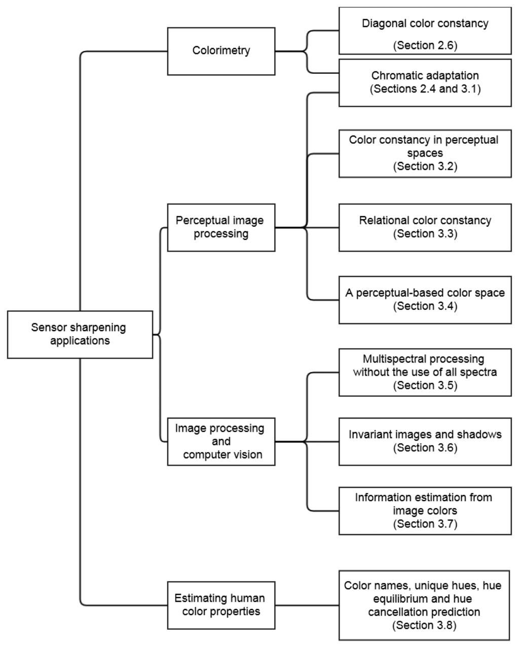 We have also described different research lines where sharpened sensors have proven useful: chromatic adaptation, color constancy in perceptual spaces, relational color constancy, perceptual-based definition of color spaces, multispectral processing without the use of all the spectra, shadow removal, extraction of information from an image, estimation of the color names and unique hues presented in the human visual system, and estimation of the hue cancellation and hue equilibrium phenomena.