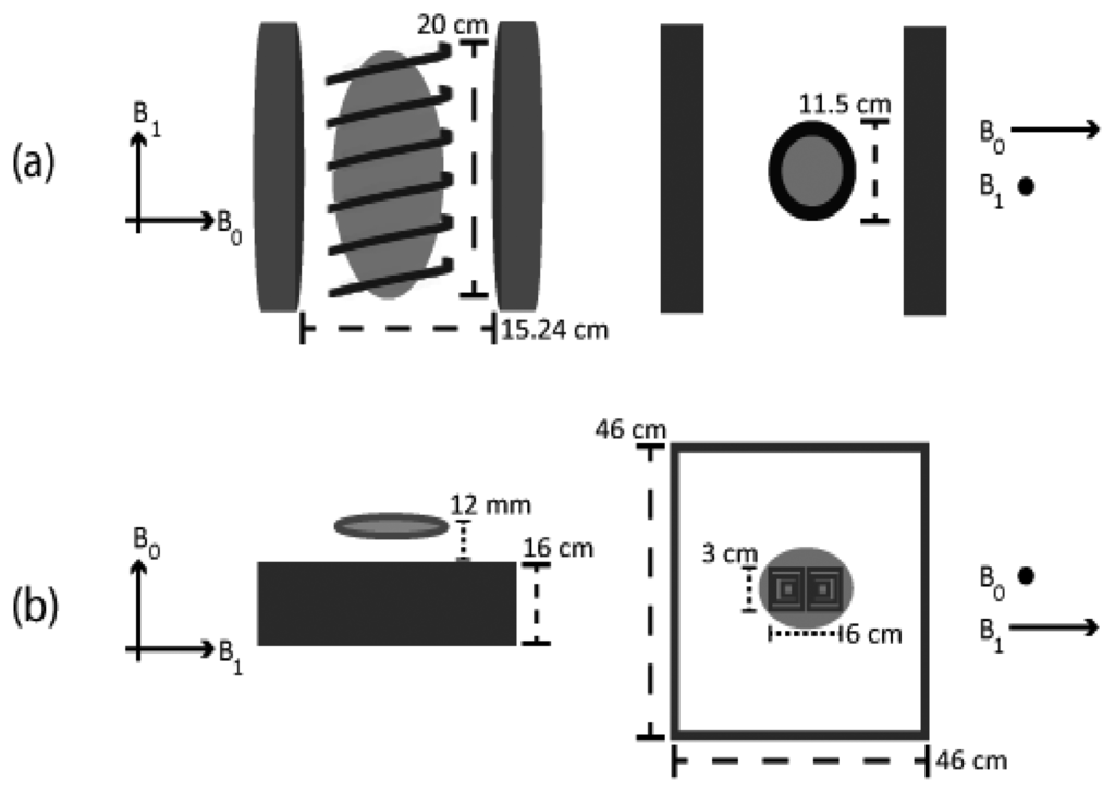Several analytical methods that are traditionally used to measure food spoilage fail in the industrial tomato paste manufacturing domain. Laser and other optical methods that involve passing light through a sample require non-metal, transparent containers []. Mass spectrometry threatens tomato paste sterility as it is an invasive process that requires the container seal to be broken for sampling []. Nuclear magnetic resonance (NMR), on the other hand, is a non-invasive approach that has gained traction recently in studying problems in industrial process environments [–]. These examples share the common theme of being modifications to the conventional NMR approach involving a sample in a non-metal container enclosed by a large magnet. In the case of tomato paste these conditions do not apply. Firstly, the container is a 1,000 L non-ferrous, metal-lined tote that cannot fit inside of a standard magnetic resonance or imaging magnet. Moreover, the tote is filled with ca. 1 metric tonne of tomato paste and cannot be moved to the sensor. The aluminum lining in these totes presents an additional problem as eddy currents are generated on the surface of the metal that attenuate the applied radio frequency (rf) magnetic field []. The skin depth δ = (2/μσω)1/2, written in terms of the metal conductivity σ, the metal magnetic permeability μ, and angular frequency ω, is the distance into metal at which incident radiation is attenuated by e−1 []. Traditional NMR spectroscopy operates at Larmor frequencies ω0/2π = γ B0 > 100 MHz yielding δ < 8 μm for aluminum. This shielding prevents signals from being observed through the 75 μm thick aluminum layer incorporated into the tote material.