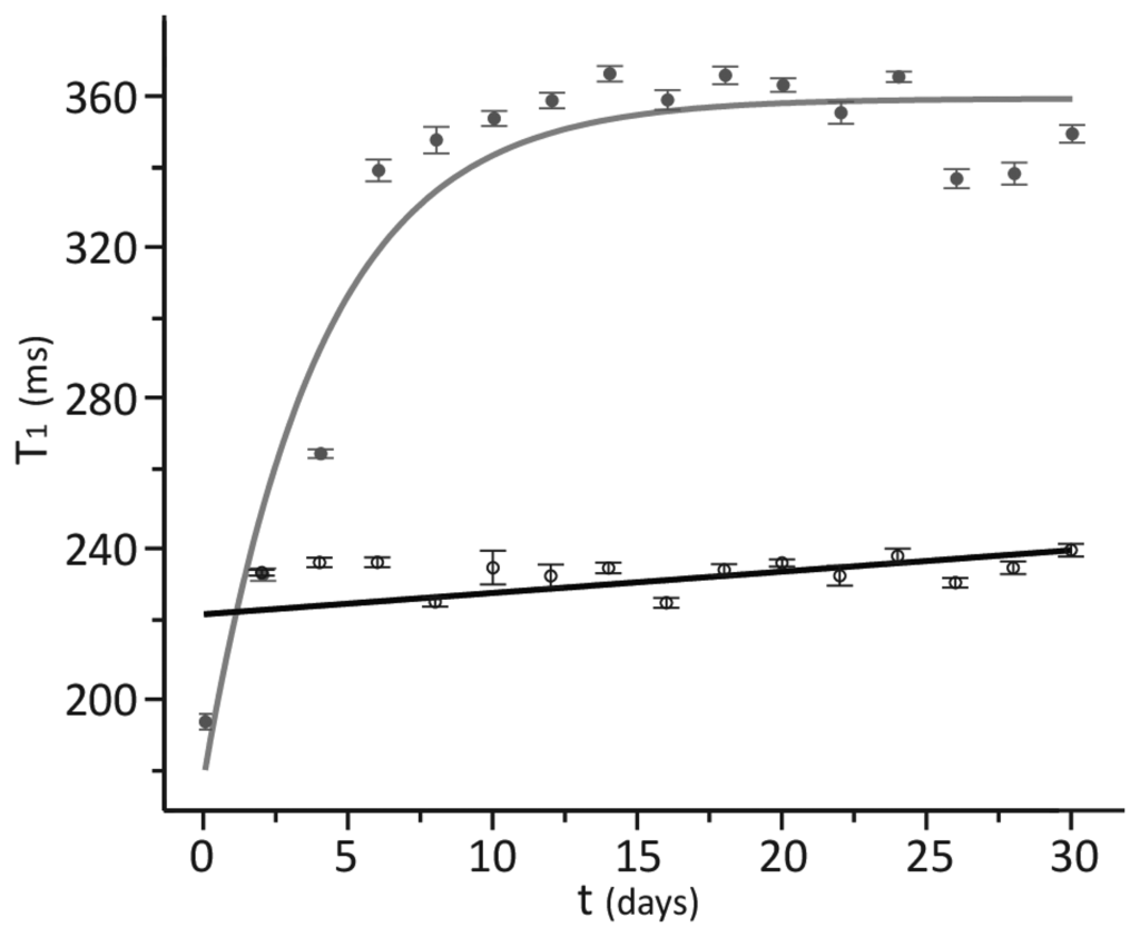 The low temperature measurements were accomplished on ten randomly selected sterile and unsterile samples. These samples were only removed from the low temperature storage refrigerator for t ≈ 5 min to obtain the T1 and T2 values reported in Table 1. Given the heat capacity of the tomatoes and the glass container, the temperature rise during this time was less than +3 °C. As long as the storage temperature was maintained below 5 °C, the T1 and T2 values remain constant over the course of at least one month. Room temperature T1 and T2 measurements were accomplished on all thirty samples. The fifteen sterile and unsterile samples were separated into three separate batches. The first batch of five samples each was removed from the refrigerator and allowed to warm to room temperature over the course of an hour. The T1 and T2 values for these samples were monitored every two days for a thirty day period. At day fifteen of these measurements, a second batch of five samples each was removed from the refrigerator and the measurements were repeated in parallel with the first batch. On the final day of measurements for the first batch, the third batch of five samples each was removed from the refrigerator and measurements were repeated in parallel with the second batch. Although the room temperature T2 value was constant as a function of time for these samples as shown in Table 1, the corresponding T1 values as shown in Figure 3 were not.