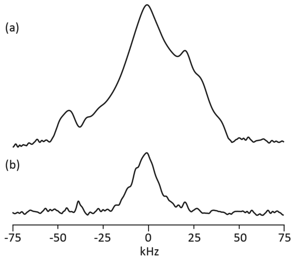 Operation at a decreased magnetic field strength in comparison to standard NMR spectroscopy was motivated by the need to recover signals from samples enclosed in non-ferrous, metallic containers. Here the lower induced Larmor frequency ca. 4–5 MHz increases the penetration depth of the applied and detected radio frequency fields by about an order of magnitude in comparison to that anticipated by using typical 400–500 MHz values. As long as the effect of the non-ferrous metallic container on the tank circuit tuning and impedance matching properties have been properly compensated, the metal container can be modeled as a simple attenuator. In other words, the 4 MHz resonance frequency of the NMR tank circuit shifts to higher frequency when a non-ferrous, metallic container is studied. In the case of the plastic coated, 75 μm thick aluminum aseptic tote material, the shift is ca. 1 MHz. The addition of extra capacitance in parallel with both the tuning and matching capacitors returns the circuit resonance frequency to the original 4 MHz value. Although the circuit quality factor after this adjustment returns to the metal free value, the optimum π/2 rf pulse length is longer for the same applied rf power and the signal size is smaller. Similar efforts were necessary when the unique single sided coil/magnet system were used. The increased rf pulse length and decreased signal size can be appreciated with reference to Figure 4. Here the NMR signals for a 100 mL VWR bottle without and with the aseptic tote material are compared in Figure 4a,b, respectively. The decreased excitation bandwidth and signal-to-noise ratio in Figure 4b in comparison to Figure 4a demonstrate the attenuation effect.