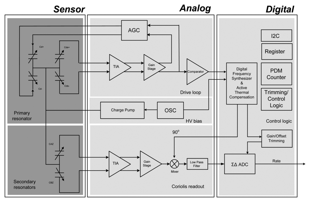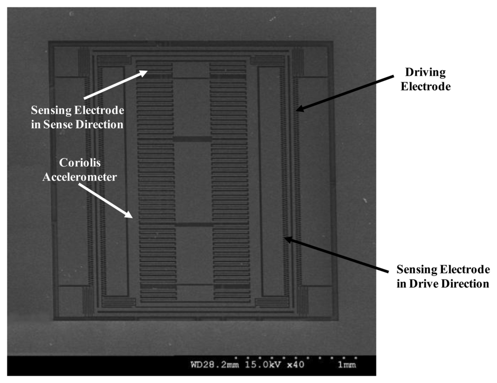 To identify the position and attitude in a system, inertial sensors such as gyroscopes are usually used to measure external angular rates. Optical gyroscopes are traditionally adopted because of their high accuracy, but they are bulky and expensive which makes it hard to implement them in consumer applications. For these reasons micro-machined gyroscopes have been one of most significant inertial sensor developments in the last decade owing to their small size and low cost. They have been successfully employed in many applications including tablets, smart phones, remote controls, camera stabilization, etc. [1,2]. The Coriolis coupling effect is the principle of the MEMS vibratory gyroscope since it identifies the angular rate input according to the detected Coriolis force acting on a vibrating mass [3]. In other words, when a vibratory gyroscope is subjected to an angular velocity, the energy is transferred from the vibrating axis to another sensing axis by the Coriolis coupling effect. The response of the sensing axis provides information about the applied angular velocity.