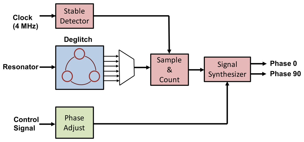 The major functions in digital circuit are frequency synthesizer and I2C interface. In the proposed vibratory micro-gyroscope, the low frequency angular rate signal is carried by the resonator's resonant frequency. In order to demodulate this rate signal and suppress the quadrature error by the feedback capacitors, a frequency synthesizer with noise suppression is utilized to generate the 90 degree and 0 degree phase delay signal, respectively. The block diagram of the frequency synthesizer circuit is shown in Figure 11. When the ASIC is power on, the stable detector is utilized to ensure the clock signal from analog part is stable for sample and count. Moreover, a comparator is adopted in driving loop to transfer the resonator signal to digital clock signal for frequency synthesis. However, the glitch is occurred in the output of the comparator due to the noise in resonator signal. Therefore, a deglitch circuit is adopted to eliminate the glitch in resonator signal. Then, the sample and count block is used to detect the frequency of resonator. Finally, the frequency synthesizer can generate the 0 degree and 90 degree phase delay signals with 50% duty cycle according to the sample and count block. Furthermore, the access in the register including the calibration codes, the active thermal compensation codes and the data transmission is implemented by the I2C interface.