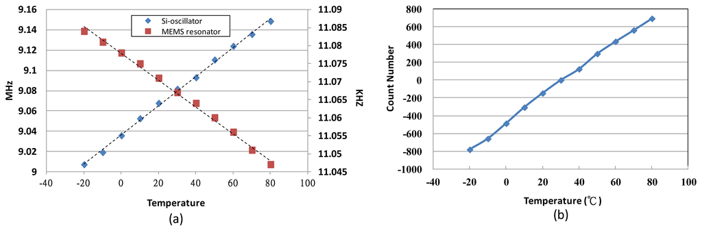 On the other hand, a modified method is adopted in this study to detect the environment temperature by the temperature characteristics of the fabricated micro-gyroscope's resonator and a silicon oscillator without using an additional temperature sensor. The temperature characteristics of the resonators are shown in Figure 12a. The TCf1 of the proposed micro-gyroscope and the silicon oscillator is about −33 ppm/°C and 157 ppm/°C, respectively. By dividing these two frequencies, a temperature dependent count number can be obtained as shown in Figure 12b. This count number is utilized to estimate the current temperature for the TBD compensation system, which is discussed in the following section.
